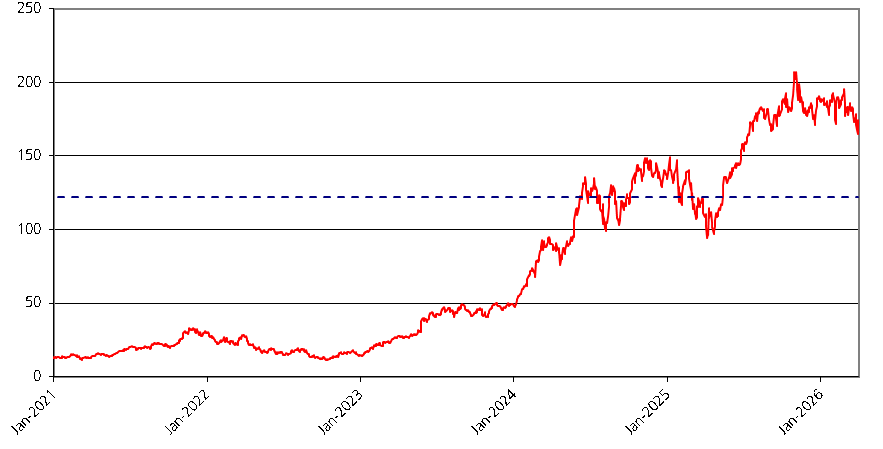 We obtained the information regarding the historical performance of the Reference Asset in the graph below from Bloomberg, without independent review or verification. The graph below illustrates the performance of the Reference Asset from January 1, 2021 through March 31, 2026. The dotted line represents the Contingent Coupon Barrier Value and Barrier Value of $122.08, which is equal to 70.00% of the Initial Value.
