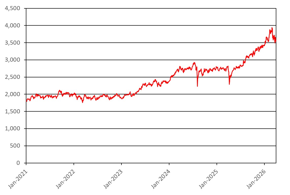 The graph below illustrates the performance of TPX from January 1, 2021 through March 30, 2026. The closing level of TPX on March 30, 2026 was 3,542.34.