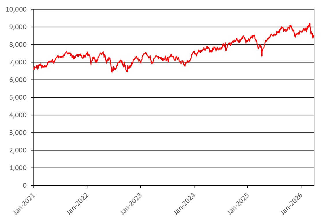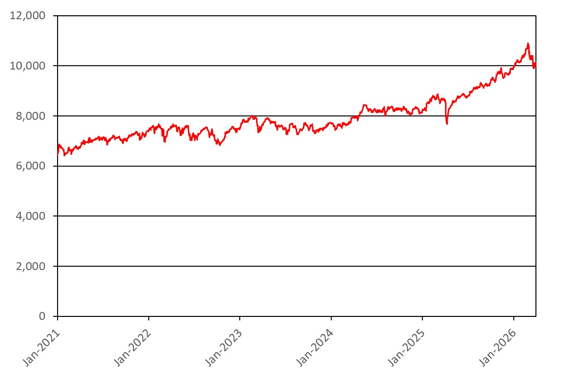 The graph below illustrates the performance of the UKX from January 1, 2021 through March 30, 2026. The closing level of the UKX on March 30, 2026 was 10,127.96.