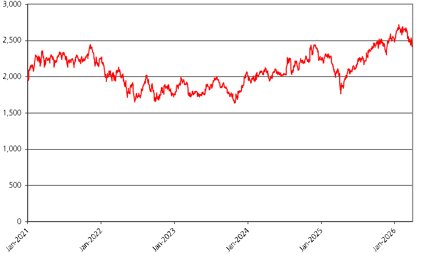 We obtained the information regarding the historical performance of the RTY in the graph below from Bloomberg, without independent review or verification. The graph below illustrates the performance of the RTY from January 1, 2021 through March 30, 2026. The closing level of the RTY on March 30, 2026 was 2,414.006. Bloomberg reports the closing level of the RTY to fewer decimal places than its sponsor.