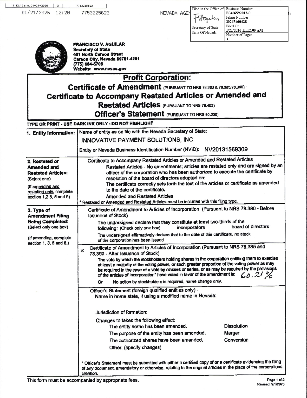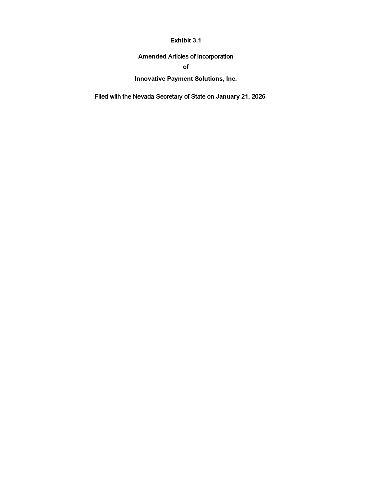 Exhibit 3.1 Amended Articles of Incorporation of Innovative Payment Solutions, Inc. Filed with the Nevada Secretary of State on January 21, 2026