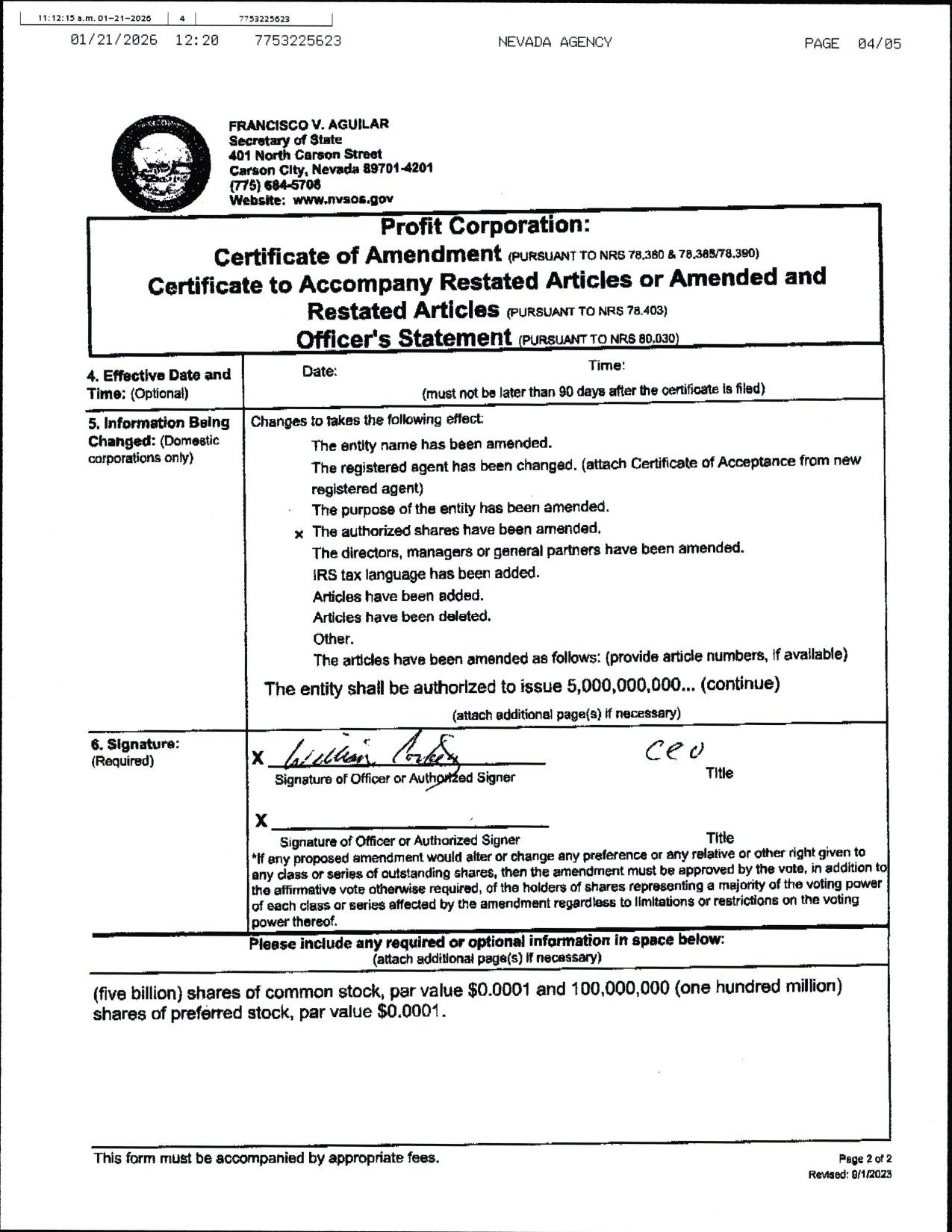 01/ 21 / 2g26 1 2 : 29 775 322 Ei623 NEVADA AGENCV J01 North Carson Street Cerson City, kevsda 89701•4101 ProĞt Corporation: CertiĞcate of Amendment (eURSUANTTONRBY8.280 A 78483/78.390) Certifîcate to Accompany Restated Articles or Amended and Restated A )cI@Ğ (PUR6UAHT TO NR6 t8.403) Offlcer's Statement w Rs«aNTTONR680.D1O Effbct ve Data Time: (Opt \ onal) . Infermation Ba Chehgad: (Domestic cotporat one only) gnatu (Required) (must not be later than 60 days after Ihe oertifio8te te filad) Changes to takes tha following eflect: The entity name has been amended. The registered agent has been changed. (ettach Certificate of A coeptence from n6w Signature of Offioer or Auth reg/ste gant) The purpose of the entity has bean amended. The a u thorizedaharas have been amended, The directors, manager8 or general paMer8 have been amended. IRS tax language has been added. Artidaa have been added. Artlclee hava been deleted. The aitldes hgve baen amended aa follows: (provide aitide numbers, If available) The entity shall be authorized to issue 5,000,000,000... (continue) (attach additional paga(s) if necessary) Tltle 84/ 85 Signature of Officer or Authorized Signer Title ‘P sny proposed amendment would alter or change any preference or any relative or other right given to any dgBs or series af outstan d ingshares, then the amendment must be approved by the vote, in addition to the affirmative vote othenuise required, of the holders of shgres representing a mejority of tha voting powar of each class or series effected by the amendment ragardtess to Ilmltations or restrictions on tha voting power thereof. Please include sny requlred or optional informatio« in apece below: (attach addilJonal paga(s) if necsssvy) (five billion) shares of common stock, par value $0.0001 and 100.O00,OOO (one hundred million) shares of preferred stock, par value $0.0001. Thlş form mua ba accompaniad by appropriate faas. Pege 2 of 2 ReU4ed' 0/1/Z029