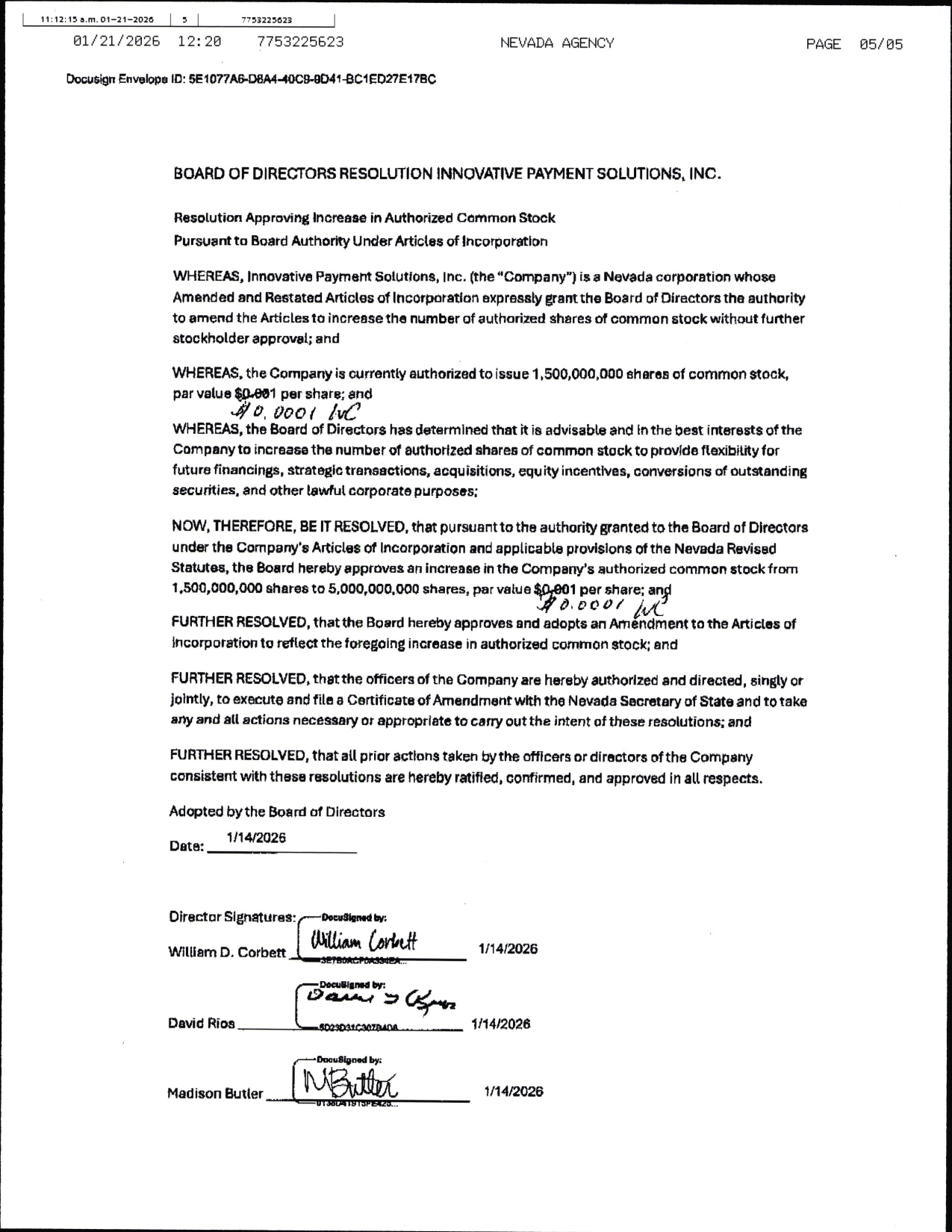 1: 12:1fl a.m.07 - 24 - Z0Z0 01/21/2026 12 : 2B 7753225623 Docuslgn Envelope ID:5E1O77AB - DBA4 - 40CB - 8 1 - AC1ED27EJ7BC NEVADA AGENCY BOARD OF DIRECTORS RESOLUTION INNOVATIVE PAYMENT SOLUTIONS, INC. Resolution Approving increase in Authorized Cdmmon Stock Pursuant to Board Authority Undar Articles of Incorpor6tlpn WHEREAS, Innovative Payment Gotuttona, Inc. (the”Company")isa Nevada corporation whose Amended and Restated Articles of Incorporation axpreaaly grant the Board of Dlractora the authority to amend the Articles to increase tha number of authorized shares of common stock without further stockholder approved; and WHEREAS. the COfTipeny ia Gurrently authorized to issue1,500,000,000 aharea of common stock, par value $D&01 per share; and WHEREAS, the Board of Directors haa d eterminedthat it is advisable and In the Deat interests of the Company to increase the number of authorized aharea of common stock toprovide ffaxibitity for future financings, strategic tranaactions, acquisitions, equity incentives, conversions of outstanding securit’ies. 8nd other lawful corporate purposes; NOW, THEREFORE, BE IT RESOLVED, tha pursuant \ o the authority granted to tha Board of Directors under the Company's Articles of Incorporation and applicab \ s provisions of the Navada Revised Statutaa, the Board hereby epproves an increase in the Company'g authorized common stock from 1,50Q,O00,000 ahares to5,000,000.000 shares, per vatue 1 pe fiere: and FURTHER RESOLVEO, that the Bogrd hereby approves and adopts an Amendment to the Articles of Incorporation to reflect the foregolng increase in authorized common stock; and FURTHER RESOLVED, th 8 t the officers of tha Company are heraby authorized and directed, singly or jointly, to execute and fila a Certiticata of Amendment with the Nevada secretary of state and to take az}y and all actions necessary of appropriate to carry out the intent of these resolutions : and FURTI•IER RESOLVED, that all prior gctlons tgken by the officers or directors of the Company consistent with thesa resolutions are hereby raifled, confirmed, and approved In all respects. Adopted by the Board of Dlractors PAGE 05/ 05 1/14/2026 Data: Director •lgnaturas A•••sh«•at«: Wllllam D. Corbett 1/14/2026 Madison Butler 1/14/2026 1/14/202B