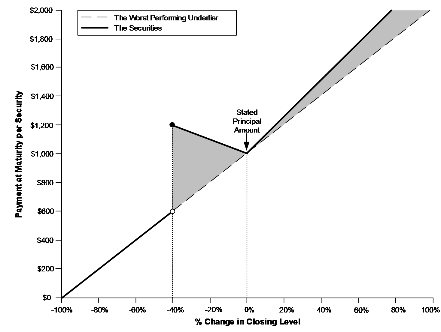 ■Downside Scenario. If the final level of the worst performing underlier is less than its downside threshold level, investors will receive an amount that is significantly less than the stated principal amount, based on a 1% loss of principal for every 1% decline in the level of the worst performing underlier. There is no minimum payment at maturity, and investors could lose their entire initial investment in the securities.