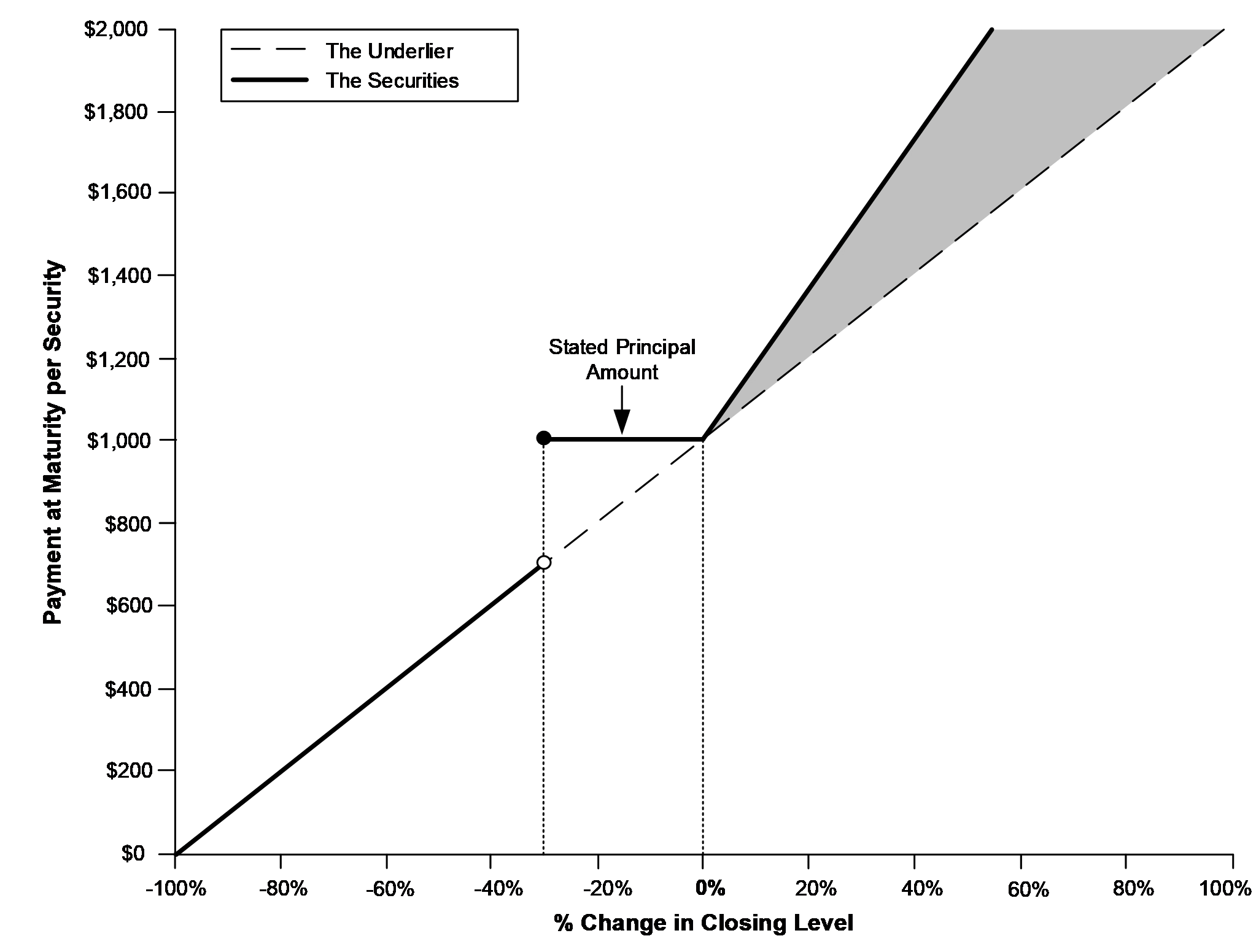 ■Payment at maturity. At maturity, if the final level is greater than the initial level, investors will receive the stated principal amount plus the leveraged upside payment. If the final level is equal to or less than the initial level but is greater than or equal to the downside threshold level, investors will receive only the stated principal amount at maturity. If, however, the final level is less than the downside threshold level, investors will lose 1% for every 1% decline in the level of the underlier over the term of the securities. Under these circumstances, the payment at maturity will be significantly less than the stated principal amount and could be zero.