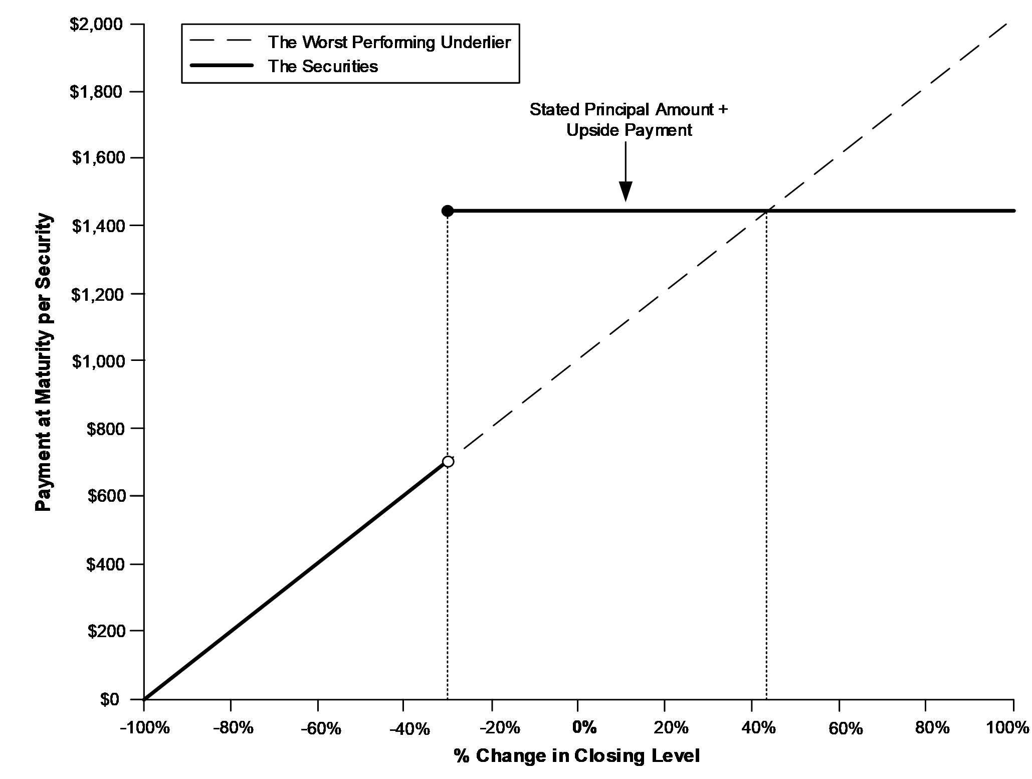 oIf the worst performing underlier appreciates 100%, investors will receive a 42.75% return, or $1,427.50 per security.