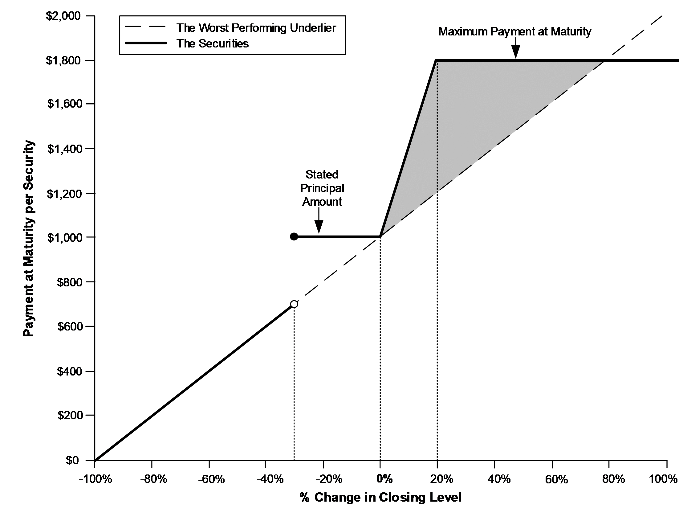 oIf the worst performing underlier appreciates 100%, investors will receive only the maximum payment at maturity of $1,800 per security, or 180% of the stated principal amount.