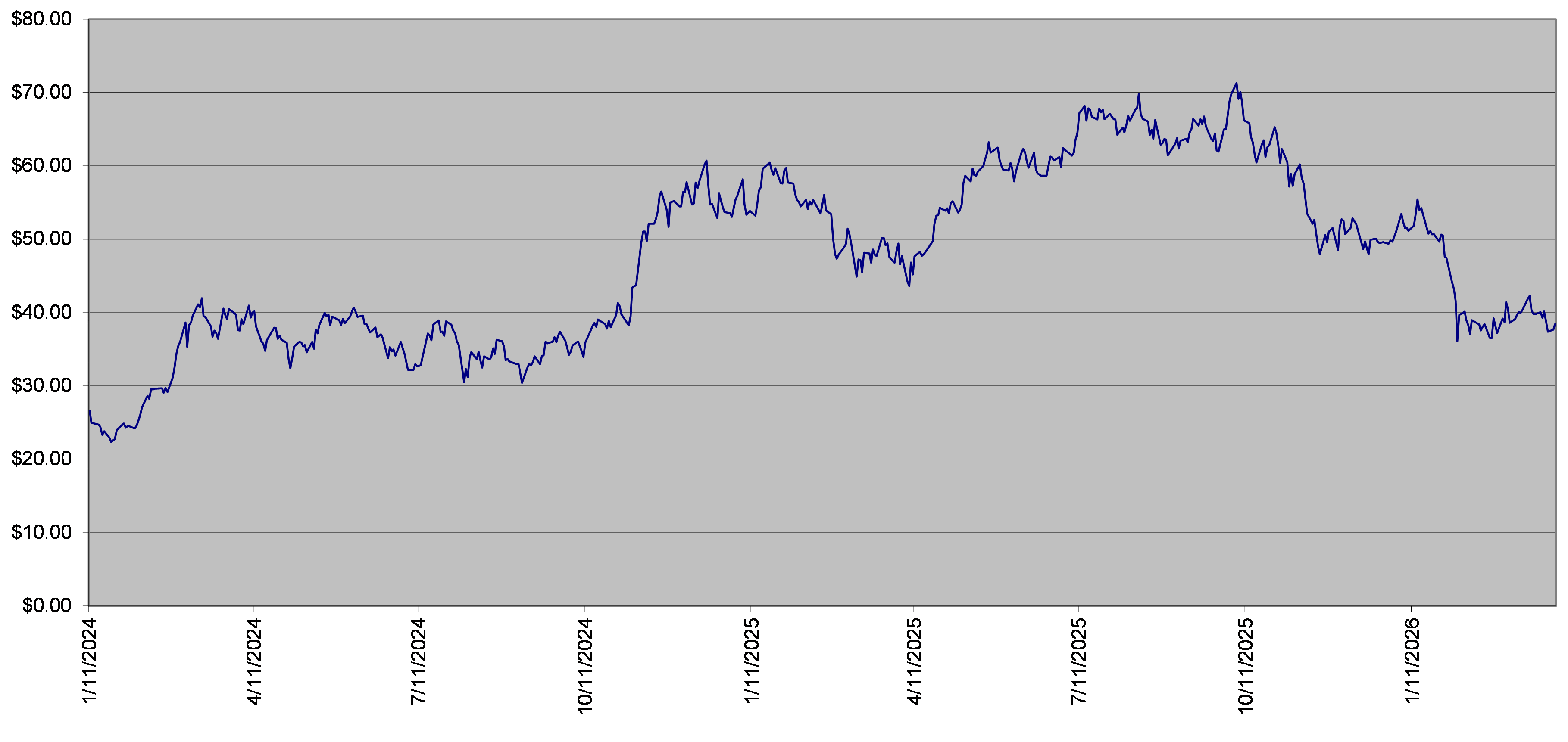The closing level of the underlier on March 31, 2026 was $38.42. The following graph sets forth the daily closing levels of the underlier for the period noted below. We obtained the historical information presented in this document from Bloomberg Financial Markets, without independent verification. The underlier has at times experienced periods of high volatility. You should not take the historical closing levels of the underlier as an indication of its future performance, and no assurance can be given as to the closing level of the underlier at any time.