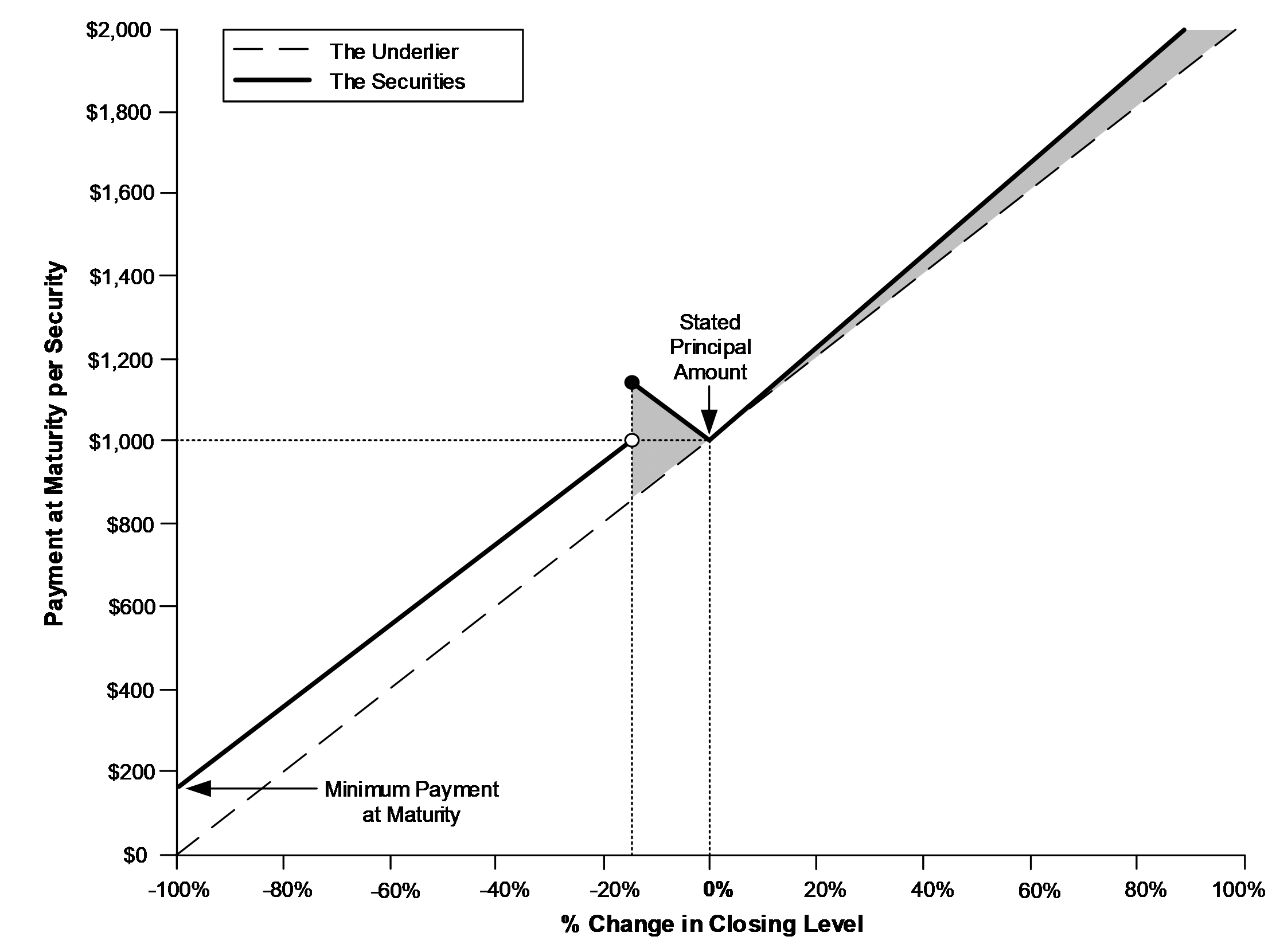 •If the final level is greater than the initial level: stated principal amount + leveraged upside payment •If the final level is equal to or less than the initial level but is greater than or equal to the buffer level: stated principal amount + (stated principal amount × absolute underlier return × absolute return participation rate) Under these circumstances, the payment at maturity will effectively be limited to a positive return of 15%. •If the final level is less than the buffer level: stated principal amount × (performance factor + buffer amount) Under these circumstances, the payment at maturity will be less, and may be significantly less, than the stated principal amount, subject to the minimum payment at maturity. |