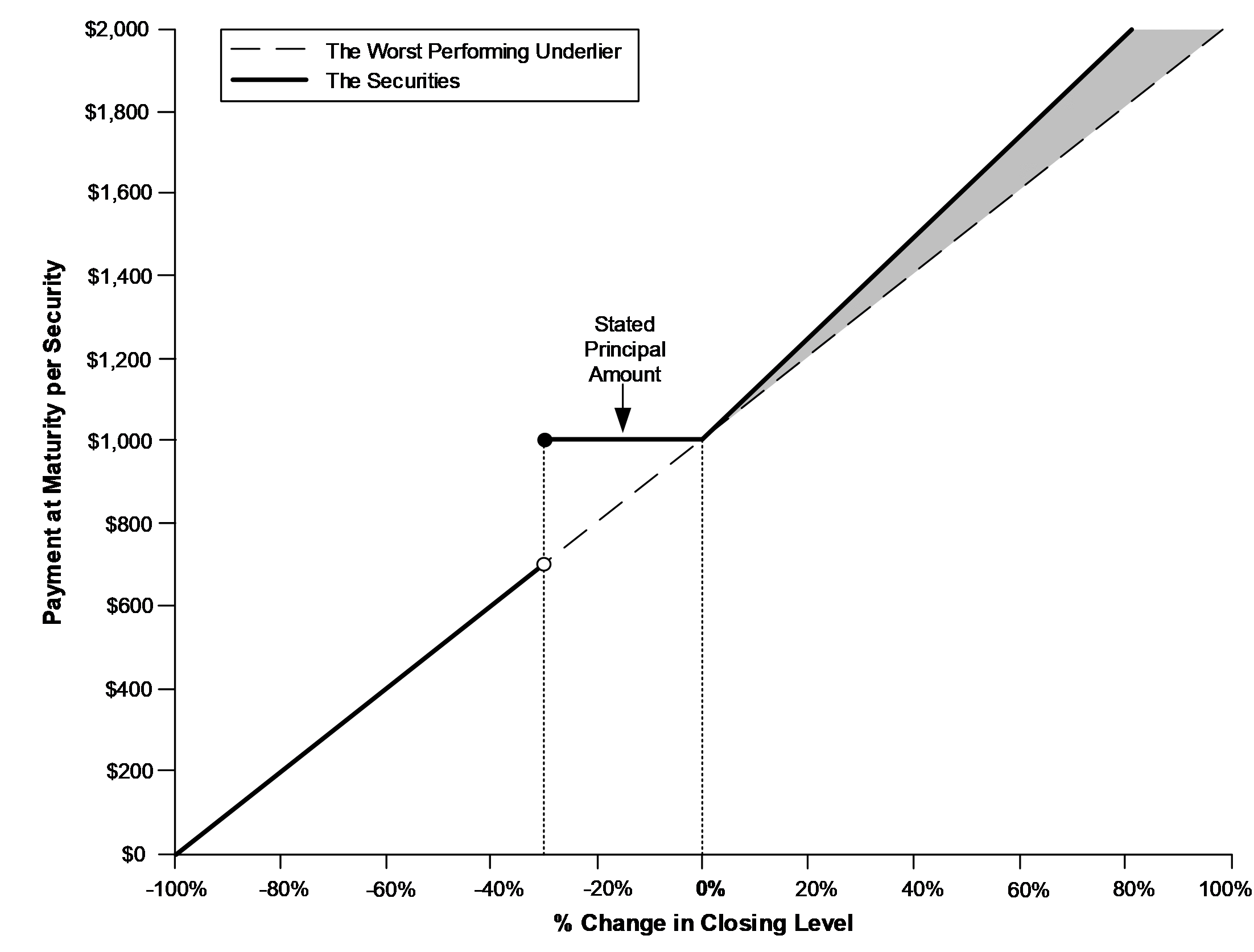 The payment at maturity will be based solely on the performance of the worst performing underlier, which could be either underlier. The payoff diagram below illustrates the payment at maturity for a range of hypothetical performances of the worst performing underlier over the term of the securities, based on the following terms: