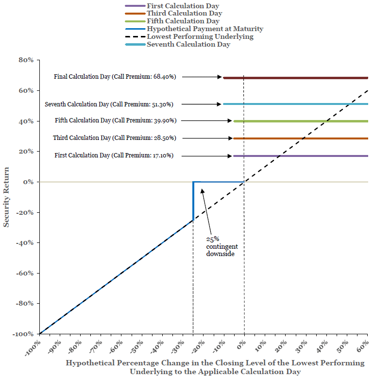 The call premium applicable to each calculation day will be a percentage of the face amount that increases for each calculation day based on a simple (non-compounding) return of approximately 11.40% per annum. The actual call premium and payment per security upon an automatic call for each calculation day are set forth in the table below. |