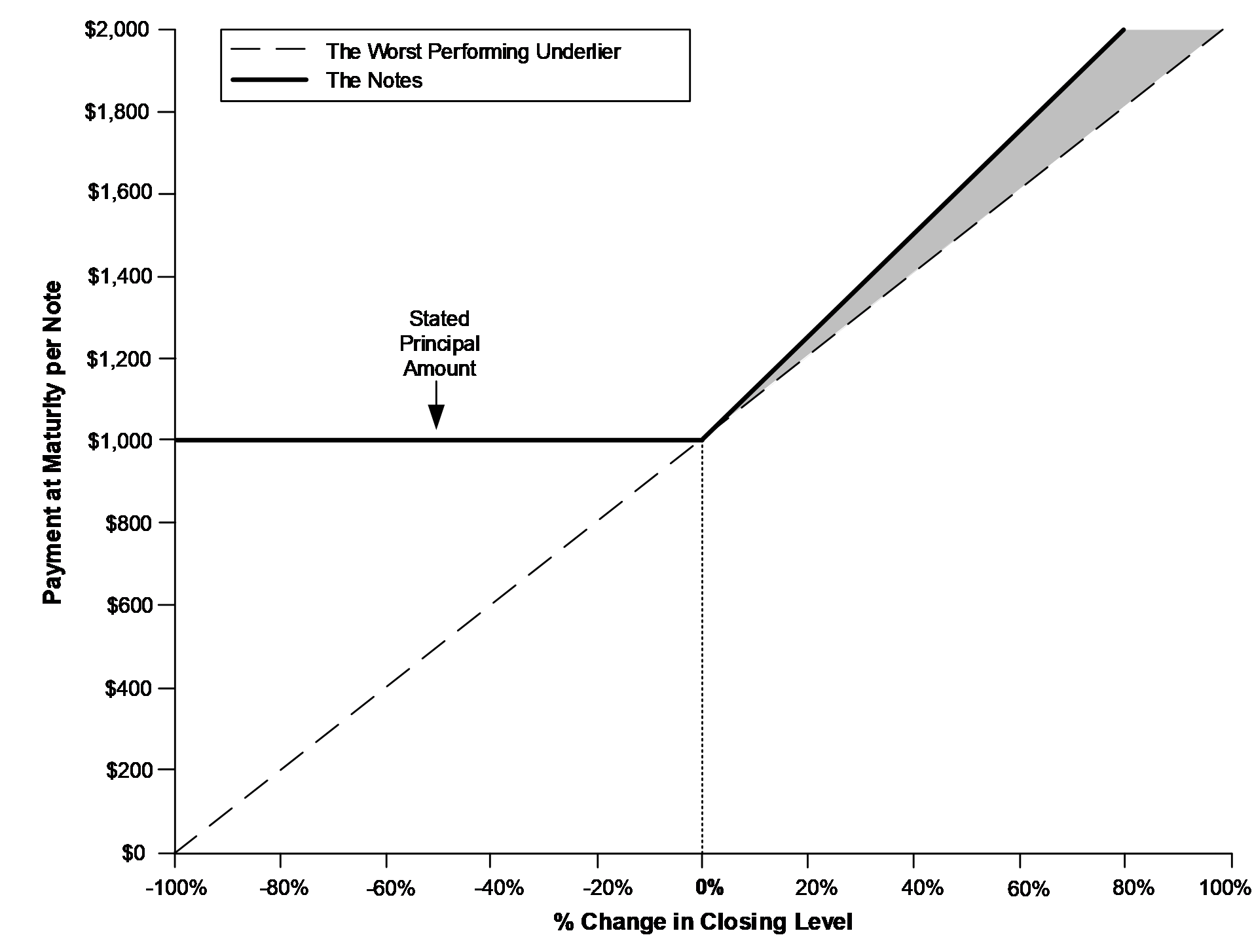■Payment at maturity. At maturity, if the final level of each underlier is greater than its initial level, investors will receive the stated principal amount plus the upside payment. If, however, the final level of either underlier is equal to or less than its initial level, investors will receive only the stated principal amount at maturity.
