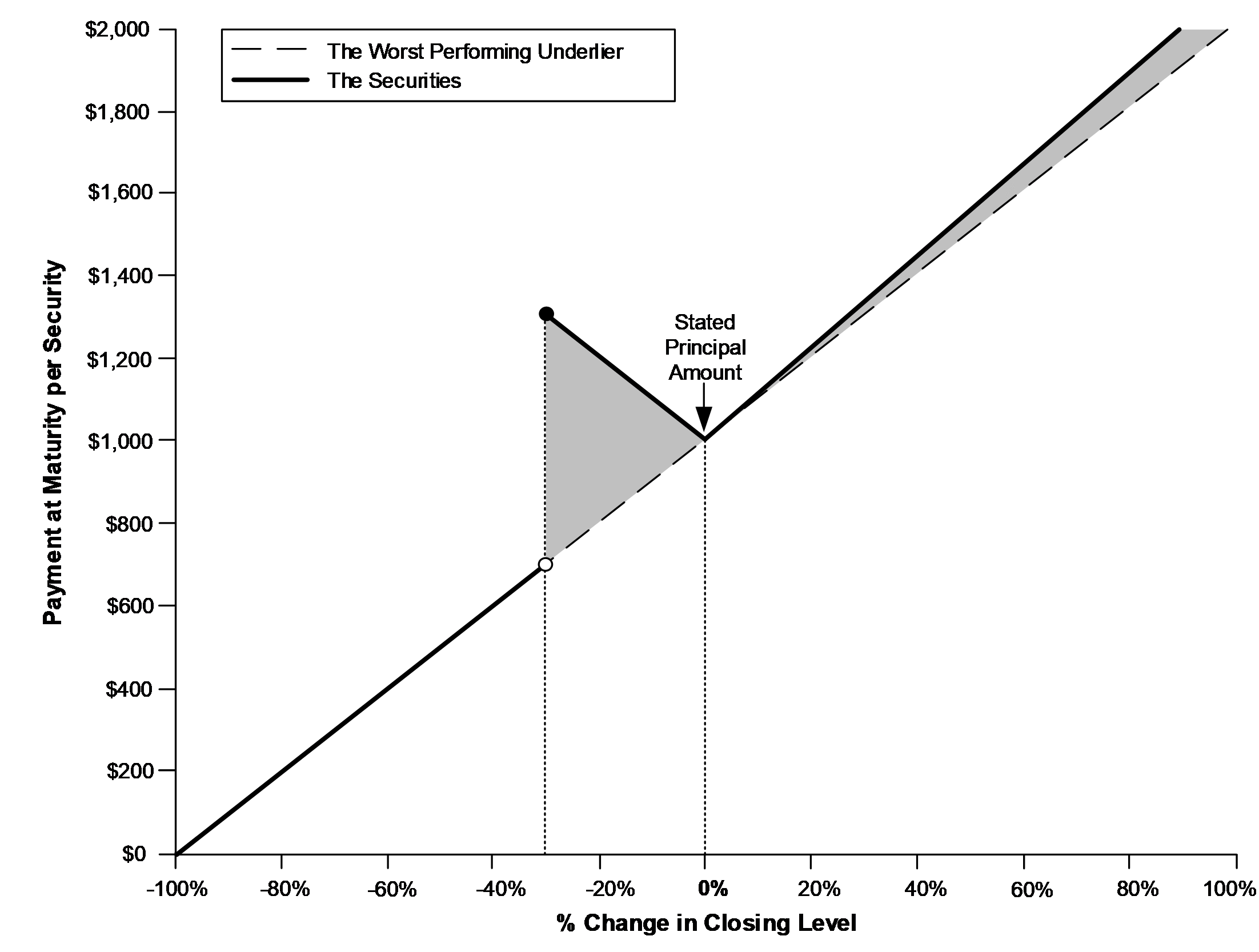■Downside Scenario. If the final level of the worst performing underlier is less than its downside threshold level, investors will receive an amount that is significantly less than the stated principal amount, based on a 1% loss of principal for every 1% decline in the level of the worst performing underlier. There is no minimum payment at maturity, and investors could lose their entire initial investment in the securities.