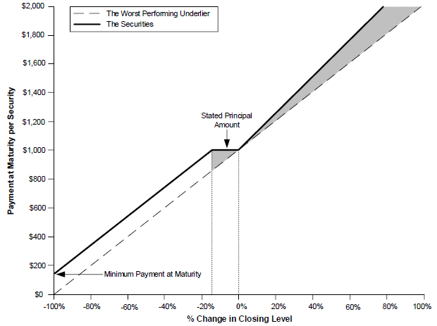 ■Upside Scenario. If the final level of the worst performing underlier is greater than its initial level, investors will receive the stated principal amount plus 121% of the appreciation of the worst performing underlier over the term of the securities.