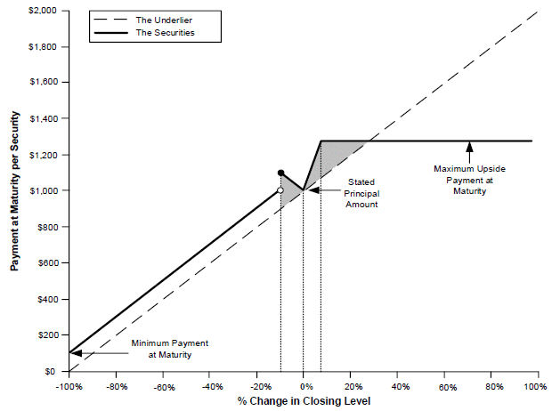 ■Any positive return on the securities that is based on the depreciation of the underlier is effectively capped. Any positive return on the securities that is based on the depreciation of the underlier will be capped, because the absolute return participation feature is operative only if the level of the underlier has not declined below the buffer level on the observation date. Any decline in the level of the underlier beyond the buffer level will result in a loss, rather than a positive return, on your initial investment in the securities.