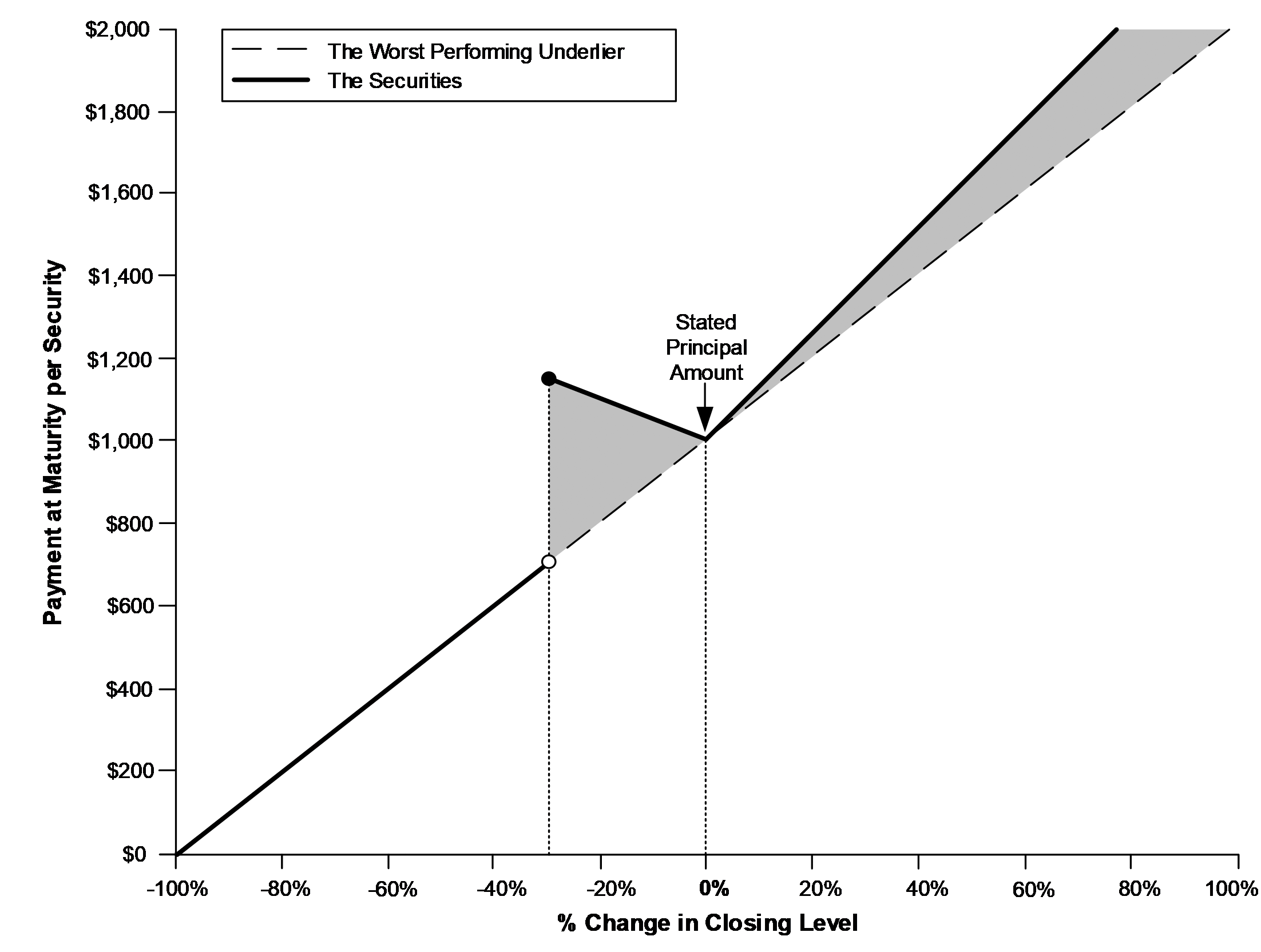 ■Payment at maturity. At maturity, if the final level of each underlier is greater than its initial level, investors will receive the stated principal amount plus the leveraged upside payment. If the final level of either underlier is equal to or less than its initial level but the final level of each underlier is greater than or equal to its downside threshold level, investors will receive at maturity the stated principal amount plus a positive return equal to (i) the absolute value of the percentage decline in the level of the worst performing underlier multiplied by (ii) the absolute return participation rate. If, however, the final level of either underlier is less than its downside threshold level, investors will lose 1% for every 1% decline in the level of the worst performing underlier over the term of the securities. Under these circumstances, the payment at maturity will be significantly less than the stated principal amount and could be zero.