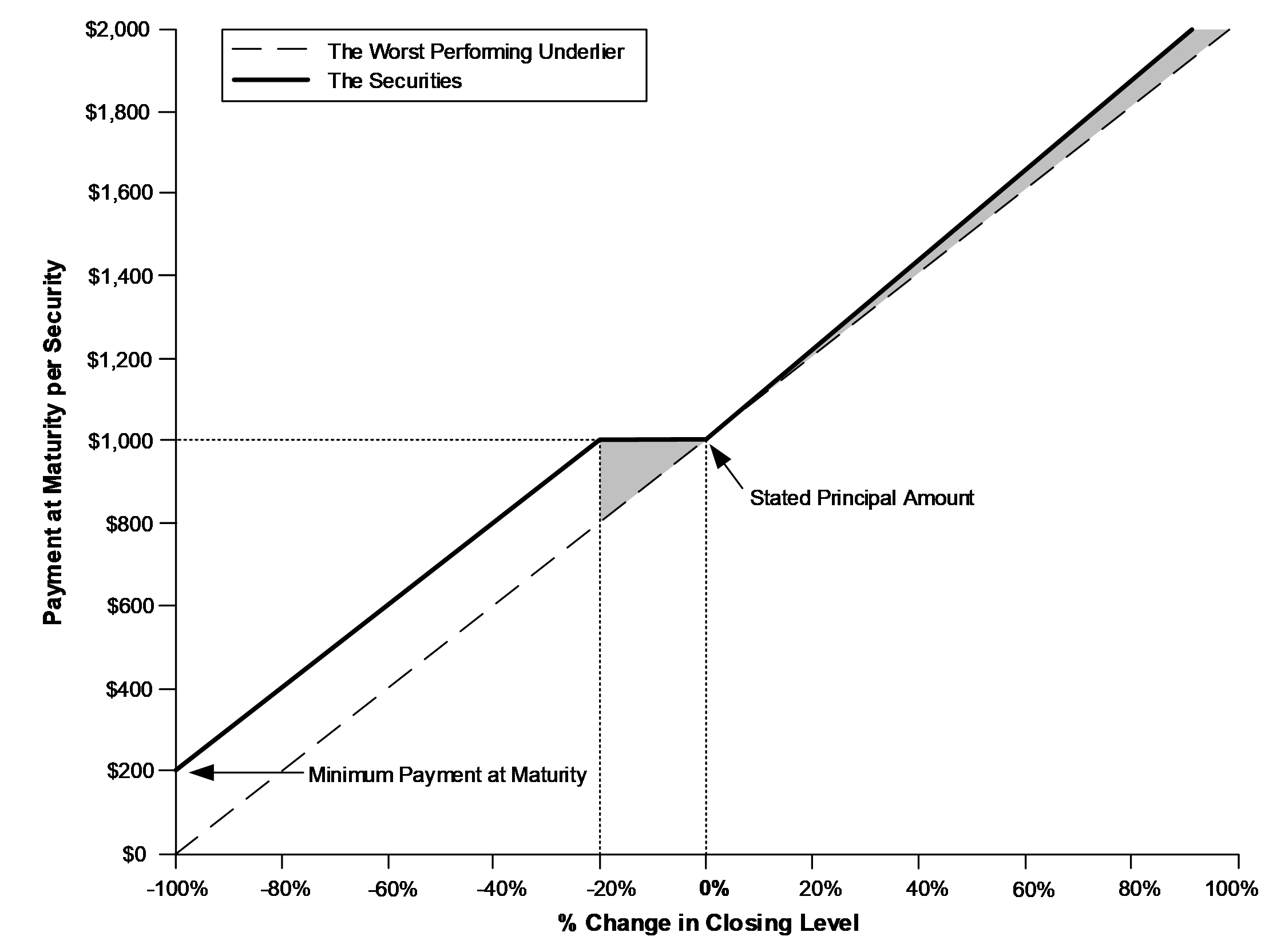 ■Upside Scenario. If the final level of the worst performing underlier is greater than its initial level, investors will receive the stated principal amount plus 113% of the appreciation of the worst performing underlier over the term of the securities.