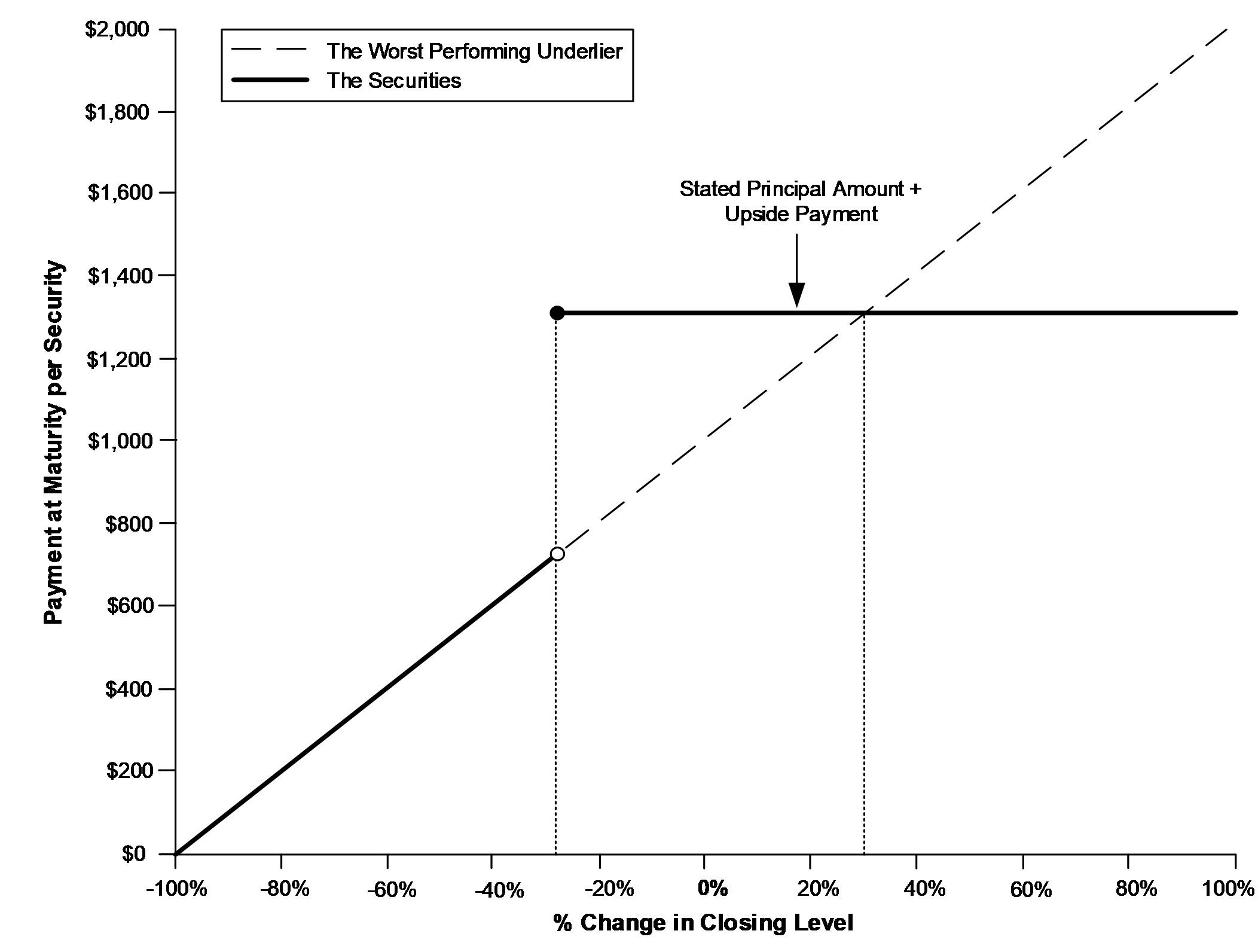 ■Payment at maturity. At maturity, if the final level of each underlier is greater than or equal to its downside threshold level, investors will receive the stated principal amount plus the upside payment specified herein. If, however, the final level of any underlier is less than its downside threshold level, investors will lose 1% for every 1% decline in the level of the worst performing underlier over the term of the securities. Under these circumstances, the payment at maturity will be significantly less than the stated principal amount and could be zero.