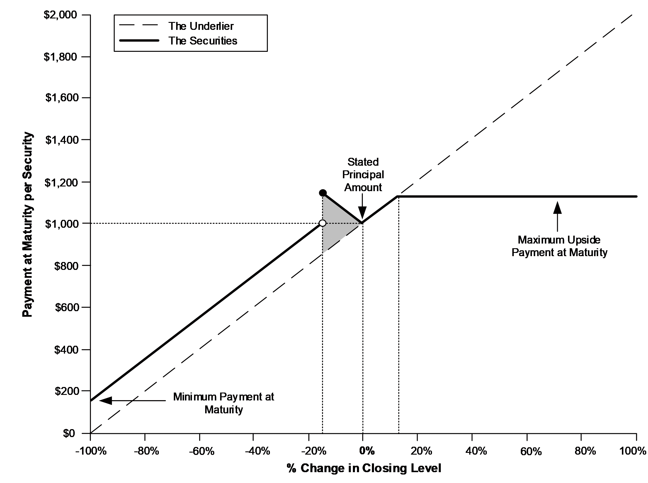 •If the final level is greater than the initial level: (stated principal amount + upside payment), subject to the maximum upside payment at maturity •If the final level is equal to or less than the initial level but is greater than or equal to the buffer level: stated principal amount + (stated principal amount × absolute underlier return × absolute return participation rate) Under these circumstances, the payment at maturity will effectively be limited to a positive return of 15%. •If the final level is less than the buffer level: stated principal amount × (performance factor + buffer amount) Under these circumstances, the payment at maturity will be less, and may be significantly less, than the stated principal amount, subject to the minimum payment at maturity. |