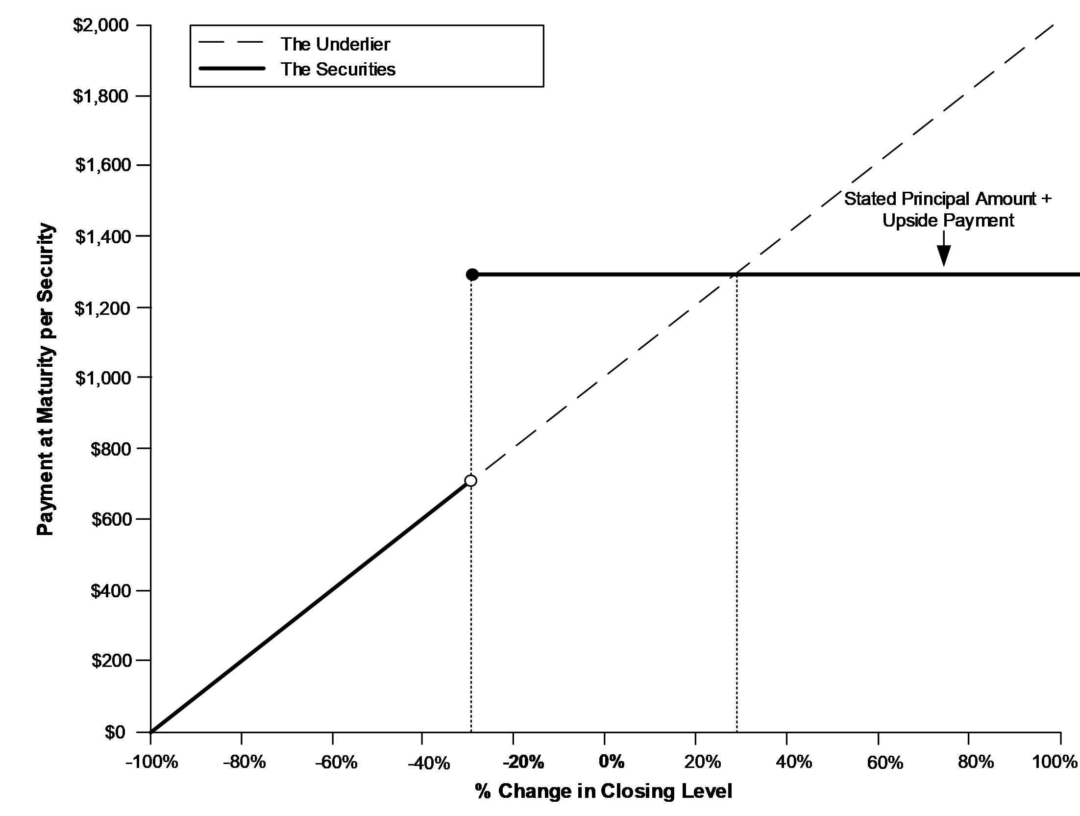 ■Payment at maturity. At maturity, if the final level is greater than or equal to the downside threshold level, investors will receive the stated principal amount plus the upside payment specified herein. If, however, the final level is less than the downside threshold level, investors will lose 1% for every 1% decline in the level of the underlier over the term of the securities. Under these circumstances, the payment at maturity will be significantly less than the stated principal amount and could be zero.