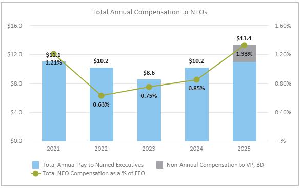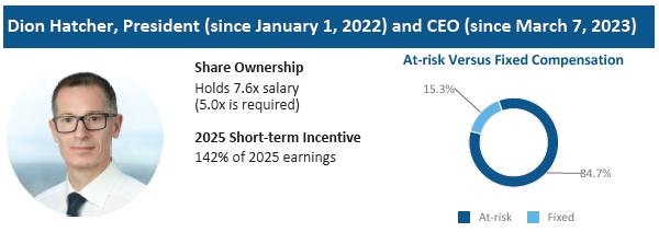 Mr. Hatcher, who has served as CEO for three years, led the Company through this period of portfolio repositioning. While the Board closely monitors TSR and other key performance metrics, it recognizes that the execution of portfolio changes across our diverse business requires time to deliver improvements that flow through to the bottom line. In light of this progress, the Board determined that the compensation outcomes in Schedule B were appropriate and reflect strong pay-for-performance alignment, including a 53% decrease in the realizable value of Mr. Hatcher’s LTIP award that vested in 2025 relative to his grant value.