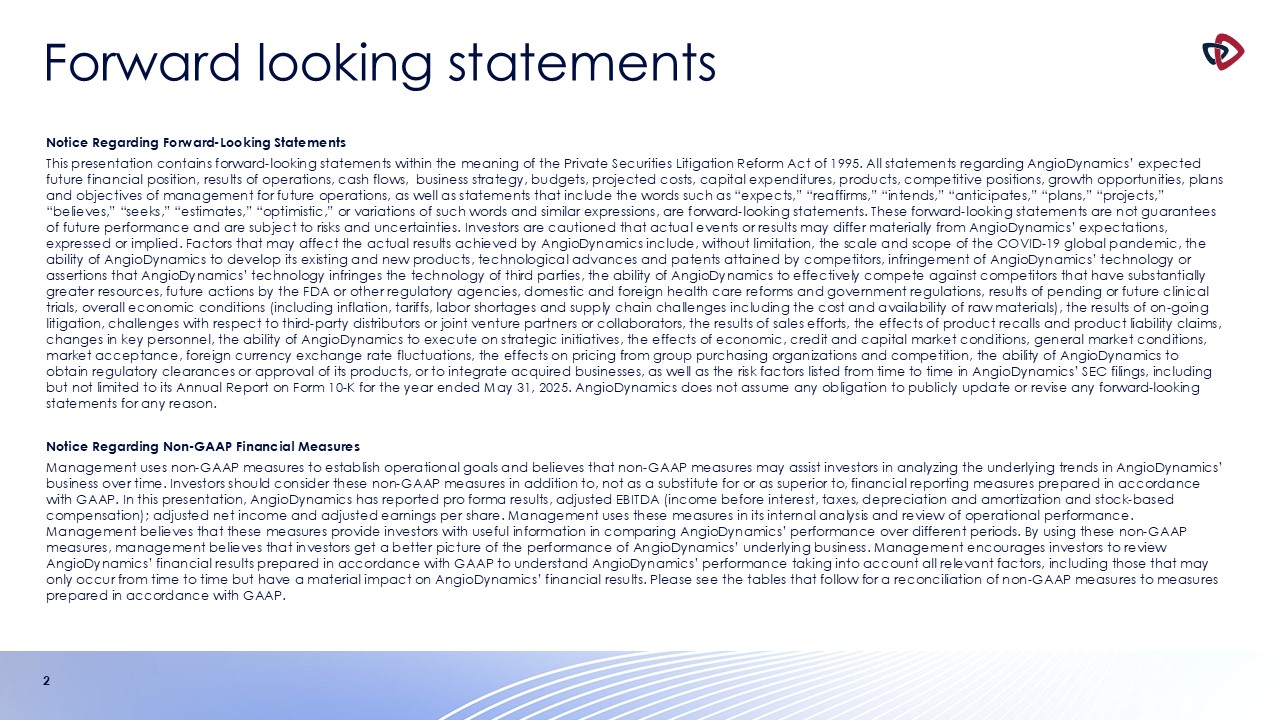 AngioDynamics does not assume any obligation to publicly update or revise any forward-looking statements for any reason. Notice Regarding Non-GAAP Financial Measures Management uses non-GAAP measures to establish operational goals and