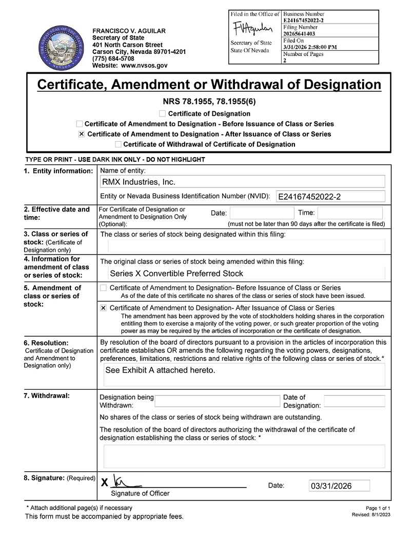 Section 1 and Section 2(a) of the Certificate of Designation of Series X Convertible Preferred Stock of RMX Industries, Inc. (the “Certificate of Designation”) are amended and restated in their entirety as follows:
