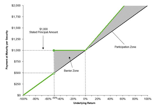 In this scenario, the underlying has depreciated from the initial underlying value to the final underlying value, but not below the final barrier value. Because the final underlying value is greater than the final barrier value, you would be repaid the stated principal amount of $1,000 per security at maturity but would not receive any positive return on your investment.