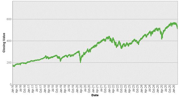 | S&P 500 Futures Excess Return Index – Historical Closing Values January 4, 2016 to March 31, 2026 |