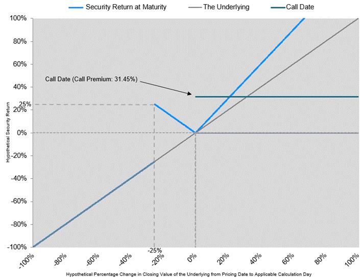 | n | Automatic Call. If the closing value of the underlying on the call date is greater than or equal to the starting value, the securities will be automatically called for redemption for an amount in cash equal to the stated principal amount plus the call premium of 31.45% of the stated principal amount |