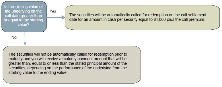 If the closing value of the underlying on the call date is greater than or equal to the starting value, the securities will be automatically called for redemption on the call settlement date for an amount in cash per security equal to $1,000 plus the call premium.
