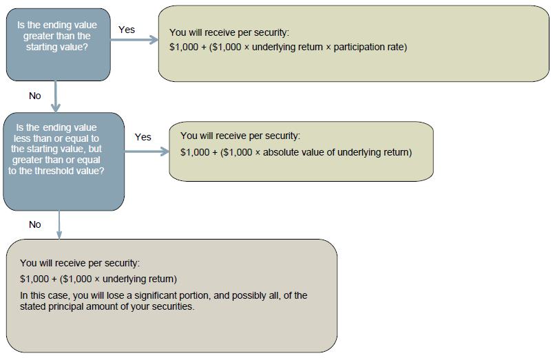 | n | If the ending value is less than the threshold value, you will lose a significant portion, and possibly all, of the stated principal amount of your securities |