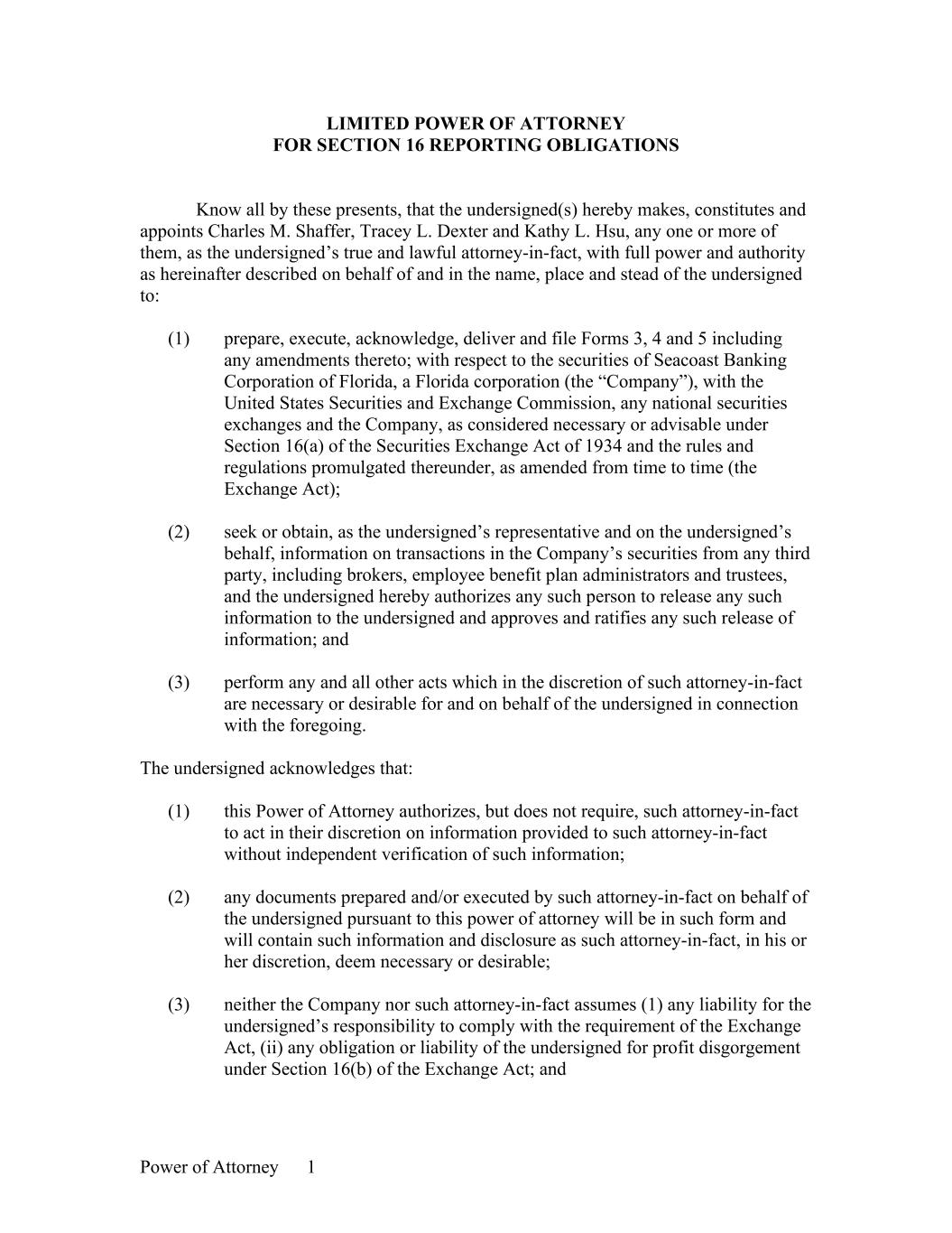 Power of Attorney 1 LIMITED POWER OF ATTORNEY FOR SECTION 16 REPORTING OBLIGATIONS Know all by these presents, that the undersigned(s) hereby makes, constitutes and appoints Charles M. Shaffer, Tracey L. Dexter and Kathy L. Hsu, any one or more of them, as the undersigned’s true and lawful attorney-in-fact, with full power and authority as hereinafter described on behalf of and in the name, place and stead of the undersigned to: (1) prepare, execute, acknowledge, deliver and file Forms 3, 4 and 5 including any amendments thereto; with respect to the securities of Seacoast Banking Corporation of Florida, a Florida corporation (the “Company”), with the United States Securities and Exchange Commission, any national securities exchanges and the Company, as considered necessary or advisable under Section 16(a) of the Securities Exchange Act of 1934 and the rules and regulations promulgated thereunder, as amended from time to time (the Exchange Act); (2) seek or obtain, as the undersigned’s representative and on the undersigned’s behalf, information on transactions in the Company’s securities from any third party, including brokers, employee benefit plan administrators and trustees, and the undersigned hereby authorizes any such person to release any such information to the undersigned and approves and ratifies any such release of information; and (3) perform any and all other acts which in the discretion of such attorney-in-fact are necessary or desirable for and on behalf of the undersigned in connection with the foregoing. The undersigned acknowledges that: (1) this Power of Attorney authorizes, but does not require, such attorney-in-fact to act in their discretion on information provided to such attorney-in-fact without independent verification of such information; (2) any documents prepared and/or executed by such attorney-in-fact on behalf of the undersigned pursuant to this power of attorney will be in such form and will contain such information and disclosure as such attorney-in-fact, in his or her discretion, deem necessary or desirable; (3) neither the Company nor such attorney-in-fact assumes (1) any liability for the undersigned’s responsibility to comply with the requirement of the Exchange Act, (ii) any obligation or liability of the undersigned for profit disgorgement under Section 16(b) of the Exchange Act; and