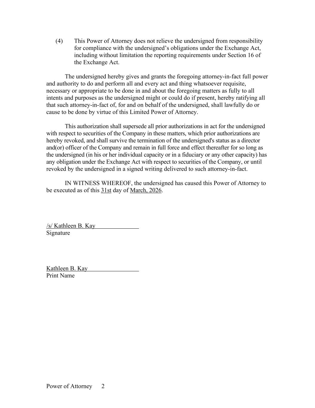 Power of Attorney 2 (4) This Power of Attorney does not relieve the undersigned from responsibility for compliance with the undersigned’s obligations under the Exchange Act, including without limitation the reporting requirements under Section 16 of the Exchange Act. The undersigned hereby gives and grants the foregoing attorney-in-fact full power and authority to do and perform all and every act and thing whatsoever requisite, necessary or appropriate to be done in and about the foregoing matters as fully to all intents and purposes as the undersigned might or could do if present, hereby ratifying all that such attorney-in-fact of, for and on behalf of the undersigned, shall lawfully do or cause to be done by virtue of this Limited Power of Attorney. This authorization shall supersede all prior authorizations in act for the undersigned with respect to securities of the Company in these matters, which prior authorizations are hereby revoked, and shall survive the termination of the undersigned's status as a director and(or) officer of the Company and remain in full force and effect thereafter for so long as the undersigned (in his or her individual capacity or in a fiduciary or any other capacity) has any obligation under the Exchange Act with respect to securities of the Company, or until revoked by the undersigned in a signed writing delivered to such attorney-in-fact. IN WITNESS WHEREOF, the undersigned has caused this Power of Attorney to be executed as of this 31st day of March, 2026. Signature Kathleen B. Kay Print Name /s/ Kathleen B. Kay