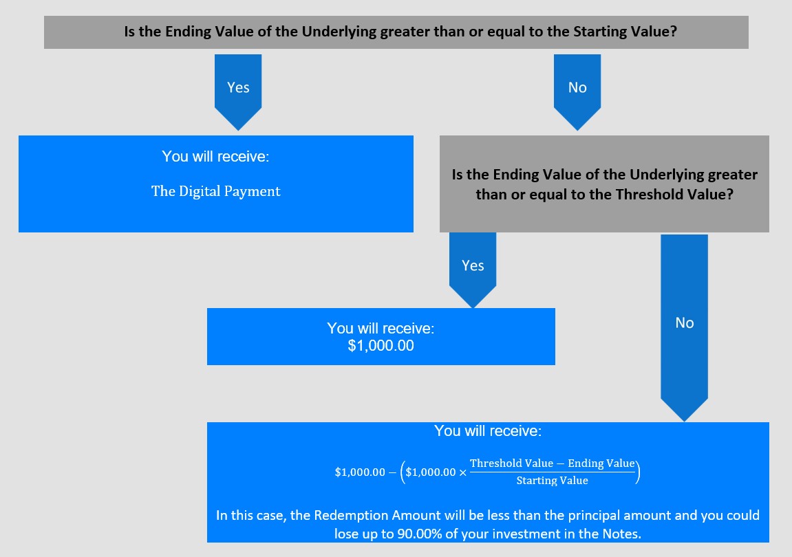 The following table is for purposes of illustration only. It is based on hypothetical values and shows hypothetical returns on the Notes. The table illustrates the calculation of the Redemption Amount and the return on the Notes based on a hypothetical Starting Value of 100, a hypothetical Threshold Value of 90, the Digital Payment of $1,125.00 per $1,000.00 in principal amount of Notes and a range of hypothetical Ending Values of the Underlying. The actual amount you receive and the resulting return will depend on the actual Starting Value, Threshold Value and Ending Value of the Underlying, and whether you hold the Notes to maturity. The following examples do not take into account any tax consequences from investing in the Notes.