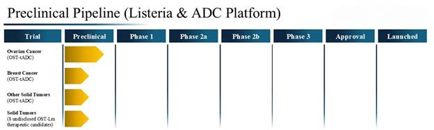 We have built a pipeline of product candidates targeting multiple indications for solid cancers. Our pipeline includes two drug technologies: (i) OST-HER2, an off-the-shelf immunotherapy, which is a type of cancer treatment that helps one’s immune system fight cancer, comprised of a genetically weakened and modified strain of Listeria monocytogenes, a species of bacteria that causes the infection listeriosis, that expresses HER2 peptides, and (ii) OST-tADC, a next generation tunable ADC with a plug-and-play platform that features tunable pH sensitive silicone linkers (SiLinkers™). The payloads may include antibodies, chemotherapeutics, cytotoxins and potentially mRNA treatments directly into and in the vicinity of solid tumors.
