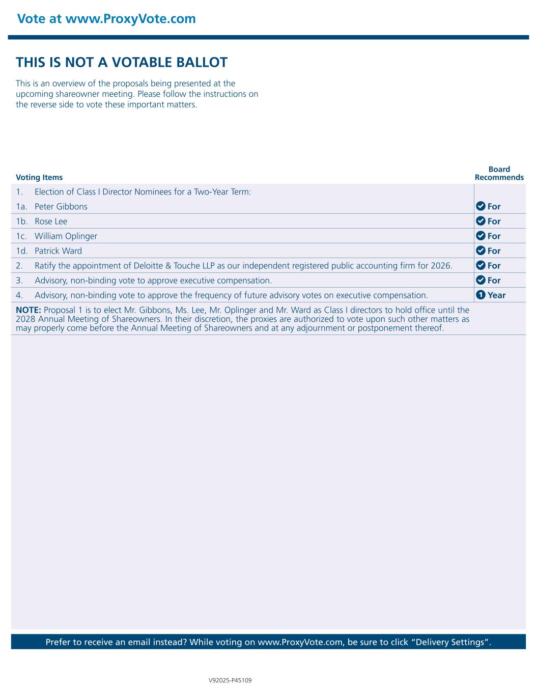 Vote at www.ProxyVote.com Prefer to receive an email instead? While voting on www.ProxyVote.com, be sure to click “Delivery Settings”. Voting Items Board Recommends V92025-P45109 1. Election of Class I Director Nominees for a Two-Year Term: 1a. Peter Gibbons For 1b. Rose Lee For 1c. William Oplinger For 1d. Patrick Ward For 2. Ratify the appointment of Deloitte & Touche LLP as our independent registered public accounting firm for 2026. For 3. Advisory, non-binding vote to approve executive compensation. For 4. Advisory, non-binding vote to approve the frequency of future advisory votes on executive compensation. 1 Year NOTE: Proposal 1 is to elect Mr. Gibbons, Ms. Lee, Mr. Oplinger and Mr. Ward as Class I directors to hold office until the 2028 Annual Meeting of Shareowners. In their discretion, the proxies are authorized to vote upon such other matters as may properly come before the Annual Meeting of Shareowners and at any adjournment or postponement thereof. THIS IS NOT A VOTABLE BALLOT This is an overview of the proposals being presented at the upcoming shareowner meeting. Please follow the instructions on the reverse side to vote these important matters.