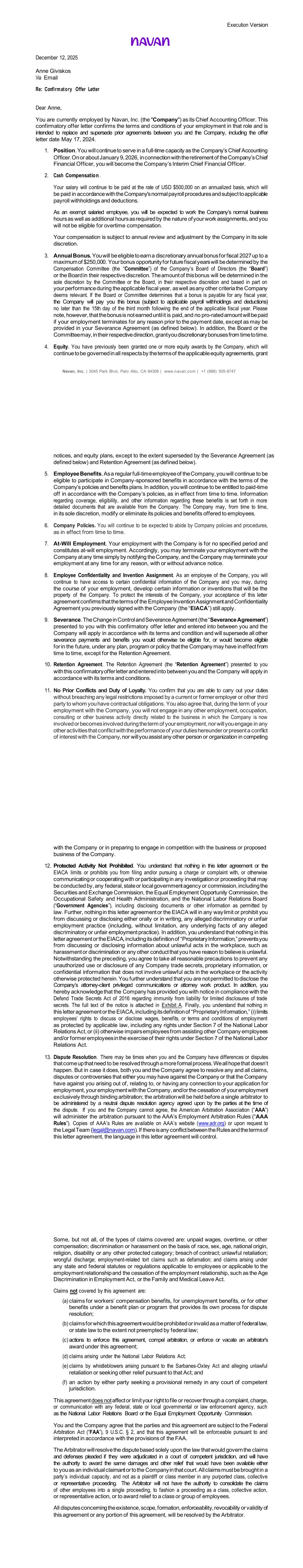 Execution Version December 12, 2025 Anne Giviskos Via Email Re: Confirmatory Offer Letter Dear Anne, You are currently employed by Navan, Inc. (the "Company") as its Chief Accounting Officer. This confirmatory offer letter confirms the terms and conditions of your employment in that role and is intended to replace and supersede prior agreements between you and the Company, including the offer letter date May 17, 2024. 1. Position. You will continue to serve in a full-time capacity as the Company’s Chief Accounting Officer. On or about January 9, 2026, in connection with the retirement of the Company’s Chief Financial Officer, you will become the Company’s Interim Chief Financial Officer. 2. Cash Compensation . Your salary will continue to be paid at the rate of USD $500,000 on an annualized basis, which will be paid in accordance with the Company's normal payroll procedures and subject to applicable payroll withholdings and deductions. As an exempt salaried employee, you will be expected to work the Company’s normal business hours as well as additional hours as required by the nature of your work assignments, and you will not be eligible for overtime compensation. Your compensation is subject to annual review and adjustment by the Company in its sole discretion. 3. Annual Bonus. You will be eligible to earn a discretionary annual bonus for fiscal 2027 up to a maximum of $250,000. Your bonus opportunity for future fiscal years will be determined by the Compensation Committee (the “Committee”) of the Company’s Board of Directors (the “Board”) or the Board in their respective discretion. The amount of this bonus will be determined in the sole discretion by the Committee or the Board, in their respective discretion and based in part on your performance during the applicable fiscal year, as well as any other criteria the Company deems relevant. If the Board or Committee determines that a bonus is payable for any fiscal year, the Company will pay you this bonus (subject to applicable payroll withholdings and deductions) no later than the 15th day of the third month following the end of the applicable fiscal year. Please note, however, that the bonus is not earned until it is paid, and no pro-rated amount will be paid if your employment terminates for any reason prior to the payment date, except as may be provided in your Severance Agreement (as defined below). In addition, the Board or the Committee may, in their respective direction, grant you discretionary bonuses from time to time. 4. Equity. You have previously been granted one or more equity awards by the Company, which will continue to be governed in all respects by the terms of the applicable equity agreements, grant Navan, Inc. | 3045 Park Blvd, Palo Alto, CA 94306 | www.navan.com | +1 (888) 505-8747 notices, and equity plans, except to the extent superseded by the Severance Agreement (as defined below) and Retention Agreement (as defined below). 5. Employee Benefits. As a regular full-time employee of the Company, you will continue to be eligible to participate in Company-sponsored benefits in accordance with the terms of the Company’s policies and benefits plans. In addition, you will continue to be entitled to paid-time off in accordance with the Company’s policies, as in effect from time to time. Information regarding coverage, eligibility, and other information regarding these benefits is set forth in more detailed documents that are available from the Company. The Company may, from time to time, in its sole discretion, modify or eliminate its policies and benefits offered to employees. 6. Company Policies. You will continue to be expected to abide by Company policies and procedures, as in effect from time to time. 7. At-Will Employment. Your employment with the Company is for no specified period and constitutes at-will employment. Accordingly, you may terminate your employment with the Company at any time simply by notifying the Company, and the Company may terminate your employment at any time for any reason, with or without advance notice. 8. Employee Confidentiality and Invention Assignment. As an employee of the Company, you will continue to have access to certain confidential information of the Company and you may, during the course of your employment, develop certain information or inventions that will be the property of the Company. To protect the interests of the Company, your acceptance of this letter agreement confirms that the terms of the Employee Invention Assignment and Confidentiality Agreement you previously signed with the Company (the “EIACA”) still apply. 9. Severance. The Change in Control and Severance Agreement (the “Severance Agreement”) presented to you with this confirmatory offer letter and entered into between you and the Company will apply in accordance with its terms and condition and will supersede all other severance payments and benefits you would otherwise be eligible for, or would become eligible for in the future, under any plan, program or policy that the Company may have in effect from time to time, except for the Retention Agreement. 10. Retention Agreement. The Retention Agreement (the “Retention Agreement”) presented to you with this confirmatory offer letter and entered into between you and the Company will apply in accordance with its terms and conditions. 11. No Prior Conflicts and Duty of Loyalty. You confirm that you are able to carry out your duties without breaching any legal restrictions imposed by a current or former employer or other third party to whom you have contractual obligations. You also agree that, during the term of your employment with the Company, you will not engage in any other employment, occupation, consulting or other business activity directly related to the business in which the Company is now involved or becomes involved during the term of your employment, nor will you engage in any other activities that conflict with the perfo