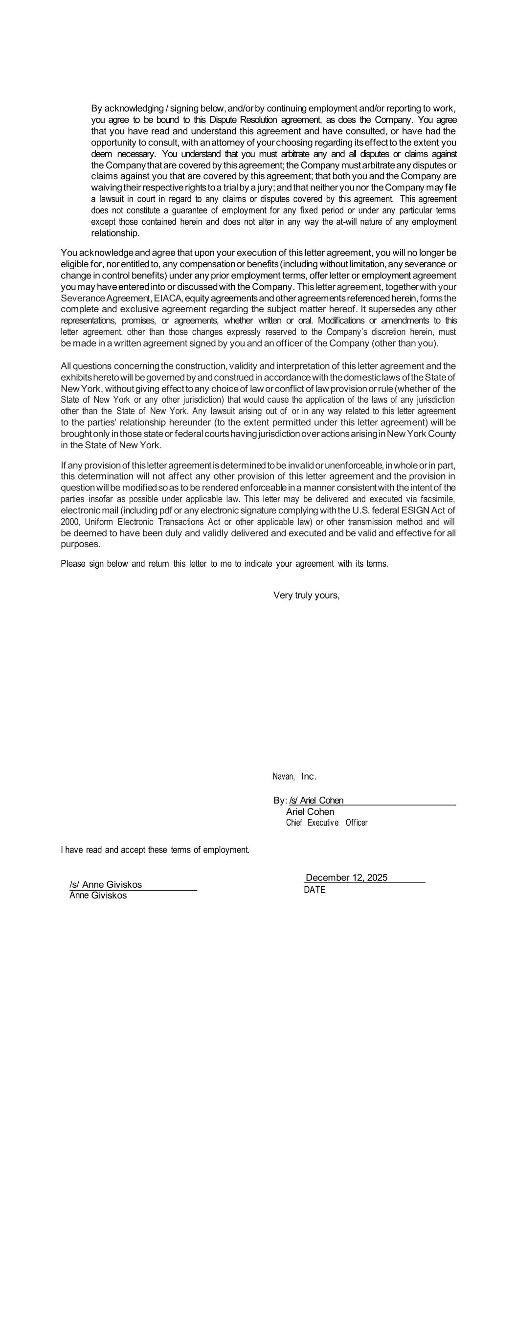 By acknowledging / signing below, and/or by continuing employment and/or reporting to work, you agree to be bound to this Dispute Resolution agreement, as does the Company. You agree that you have read and understand this agreement and have consulted, or have had the opportunity to consult, with an attorney of your choosing regarding its effect to the extent you deem necessary. You understand that you must arbitrate any and all disputes or claims against the Company that are covered by this agreement; the Company must arbitrate any disputes or claims against you that are covered by this agreement; that both you and the Company are waiving their respective rights to a trial by a jury; and that neither you nor the Company may file a lawsuit in court in regard to any claims or disputes covered by this agreement. This agreement does not constitute a guarantee of employment for any fixed period or under any particular terms except those contained herein and does not alter in any way the at-will nature of any employment relationship. You acknowledge and agree that upon your execution of this letter agreement, you will no longer be eligible for, nor entitled to, any compensation or benefits (including without limitation, any severance or change in control benefits) under any prior employment terms, offer letter or employment agreement you may have entered into or discussed with the Company. This letter agreement, together with your Severance Agreement, EIACA, equity agreements and other agreements referenced herein, forms the complete and exclusive agreement regarding the subject matter hereof. It supersedes any other representations, promises, or agreements, whether written or oral. Modifications or amendments to this letter agreement, other than those changes expressly reserved to the Company’s discretion herein, must be made in a written agreement signed by you and an officer of the Company (other than you). All questions concerning the construction, validity and interpretation of this letter agreement and the exhibits hereto will be governed by and construed in accordance with the domestic laws of the State of New York, without giving effect to any choice of law or conflict of law provision or rule (whether of the State of New York or any other jurisdiction) that would cause the application of the laws of any jurisdiction other than the State of New York. Any lawsuit arising out of or in any way related to this letter agreement to the parties’ relationship hereunder (to the extent permitted under this letter agreement) will be brought only in those state or federal courts having jurisdiction over actions arising in New York County in the State of New York. If any provision of this letter agreement is determined to be invalid or unenforceable, in whole or in part, this determination will not affect any other provision of this letter agreement and the provision in question will be modified so as to be rendered enforceable in a manner consistent with the intent of the parties insofar as possible under applicable law. This letter may be delivered and executed via facsimile, electronic mail (including pdf or any electronic signature complying with the U.S. federal ESIGN Act of 2000, Uniform Electronic Transactions Act or other applicable law) or other transmission method and will be deemed to have been duly and validly delivered and executed and be valid and effective for all purposes. Please sign below and return this letter to me to indicate your agreement with its terms. Very truly yours, Navan, Inc. By: /s/ Ariel Cohen Ariel Cohen Chief Executiv e Off icer I have read and accept these terms of employment. December 12, 2025 DATE /s/ Anne Giviskos Giviskos
