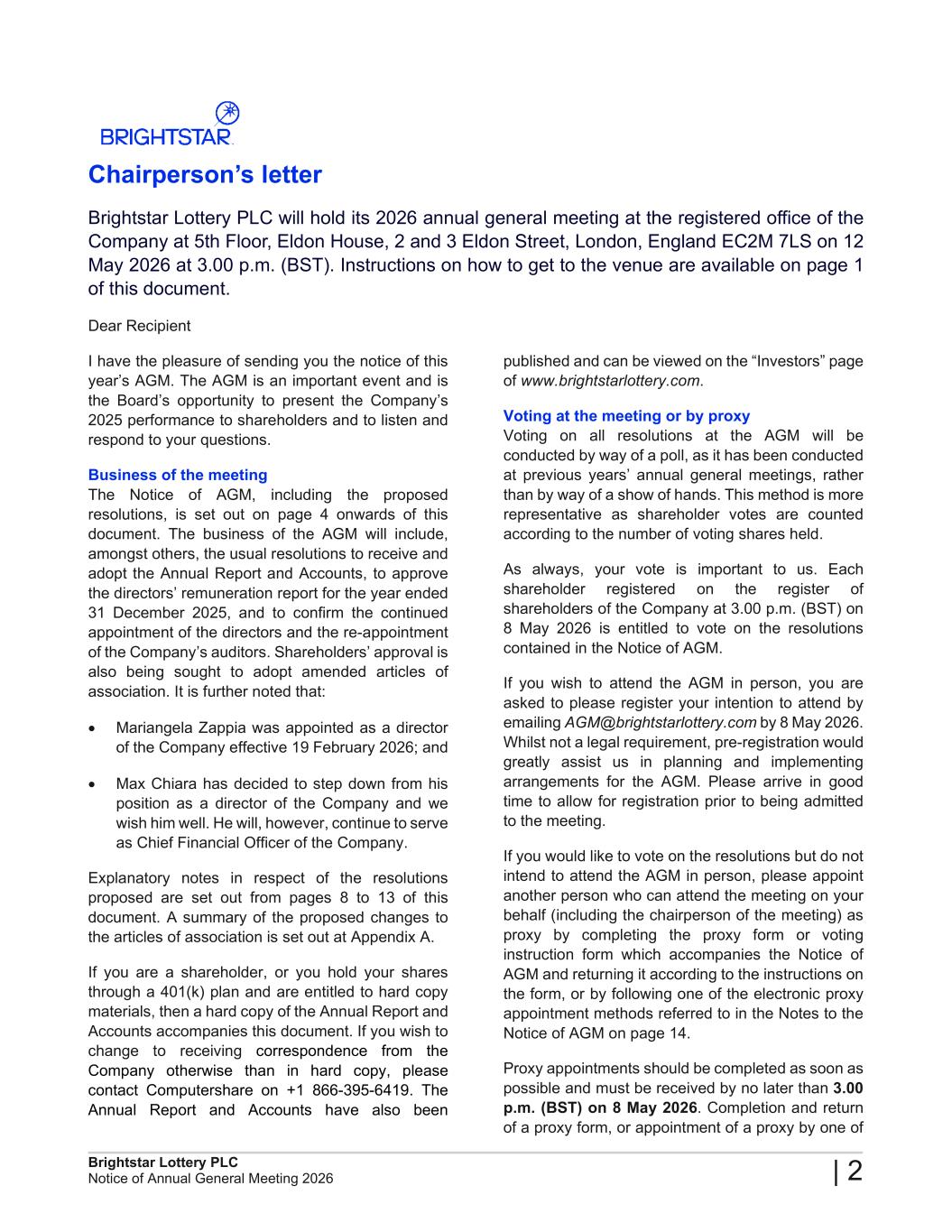 Brightstar Lottery PLC Notice of Annual General Meeting 2026 | 2 Chairperson’s letter Brightstar Lottery PLC will hold its 2026 annual general meeting at the registered office of the Company at 5th Floor, Eldon House, 2 and 3 Eldon Street, London, England EC2M 7LS on 12 May 2026 at 3.00 p.m. (BST). Instructions on how to get to the venue are available on page 1 of this document. Dear Recipient I have the pleasure of sending you the notice of this year’s AGM. The AGM is an important event and is the Board’s opportunity to present the Company’s 2025 performance to shareholders and to listen and respond to your questions. Business of the meeting The Notice of AGM, including the proposed resolutions, is set out on page 4 onwards of this document. The business of the AGM will include, amongst others, the usual resolutions to receive and adopt the Annual Report and Accounts, to approve the directors’ remuneration report for the year ended 31 December 2025, and to confirm the continued appointment of the directors and the re-appointment of the Company’s auditors. Shareholders’ approval is also being sought to adopt amended articles of association. It is further noted that: • Mariangela Zappia was appointed as a director of the Company effective 19 February 2026; and • Max Chiara has decided to step down from his position as a director of the Company and we wish him well. He will, however, continue to serve as Chief Financial Officer of the Company. Explanatory notes in respect of the resolutions proposed are set out from pages 8 to 13 of this document. A summary of the proposed changes to the articles of association is set out at Appendix A. If you are a shareholder, or you hold your shares through a 401(k) plan and are entitled to hard copy materials, then a hard copy of the Annual Report and Accounts accompanies this document. If you wish to change to receiving correspondence from the Company otherwise than in hard copy, please contact Computershare on +1 866-395-6419. The Annual Report and Accounts have also been published and can be viewed on the “Investors” page of www.brightstarlottery.com. Voting at the meeting or by proxy Voting on all resolutions at the AGM will be conducted by way of a poll, as it has been conducted at previous years’ annual general meetings, rather than by way of a show of hands. This method is more representative as shareholder votes are counted according to the number of voting shares held. As always, your vote is important to us. Each shareholder registered on the register of shareholders of the Company at 3.00 p.m. (BST) on 8 May 2026 is entitled to vote on the resolutions contained in the Notice of AGM. If you wish to attend the AGM in person, you are asked to please register your intention to attend by emailing AGM@brightstarlottery.com by 8 May 2026. Whilst not a legal requirement, pre-registration would greatly assist us in planning and implementing arrangements for the AGM. Please arrive in good time to allow for registration prior to being admitted to the meeting. If you would like to vote on the resolutions but do not intend to attend the AGM in person, please appoint another person who can attend the meeting on your behalf (including the chairperson of the meeting) as proxy by completing the proxy form or voting instruction form which accompanies the Notice of AGM and returning it according to the instructions on the form, or by following one of the electronic proxy appointment methods referred to in the Notes to the Notice of AGM on page 14. Proxy appointments should be completed as soon as possible and must be received by no later than 3.00 p.m. (BST) on 8 May 2026. Completion and return of a proxy form, or appointment of a proxy by one of