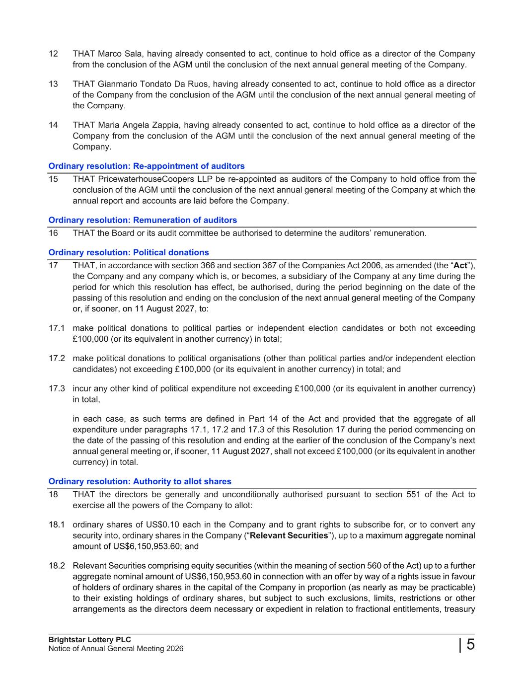Brightstar Lottery PLC Notice of Annual General Meeting 2026 | 5 12 THAT Marco Sala, having already consented to act, continue to hold office as a director of the Company from the conclusion of the AGM until the conclusion of the next annual general meeting of the Company. 13 THAT Gianmario Tondato Da Ruos, having already consented to act, continue to hold office as a director of the Company from the conclusion of the AGM until the conclusion of the next annual general meeting of the Company. 14 THAT Maria Angela Zappia, having already consented to act, continue to hold office as a director of the Company from the conclusion of the AGM until the conclusion of the next annual general meeting of the Company. Ordinary resolution: Re-appointment of auditors 15 THAT PricewaterhouseCoopers LLP be re-appointed as auditors of the Company to hold office from the conclusion of the AGM until the conclusion of the next annual general meeting of the Company at which the annual report and accounts are laid before the Company. Ordinary resolution: Remuneration of auditors 16 THAT the Board or its audit committee be authorised to determine the auditors’ remuneration. Ordinary resolution: Political donations 17 THAT, in accordance with section 366 and section 367 of the Companies Act 2006, as amended (the “Act”), the Company and any company which is, or becomes, a subsidiary of the Company at any time during the period for which this resolution has effect, be authorised, during the period beginning on the date of the passing of this resolution and ending on the conclusion of the next annual general meeting of the Company or, if sooner, on 11 August 2027, to: 17.1 make political donations to political parties or independent election candidates or both not exceeding £100,000 (or its equivalent in another currency) in total; 17.2 make political donations to political organisations (other than political parties and/or independent election candidates) not exceeding £100,000 (or its equivalent in another currency) in total; and 17.3 incur any other kind of political expenditure not exceeding £100,000 (or its equivalent in another currency) in total, in each case, as such terms are defined in Part 14 of the Act and provided that the aggregate of all expenditure under paragraphs 17.1, 17.2 and 17.3 of this Resolution 17 during the period commencing on the date of the passing of this resolution and ending at the earlier of the conclusion of the Company’s next annual general meeting or, if sooner, 11 August 2027, shall not exceed £100,000 (or its equivalent in another currency) in total. Ordinary resolution: Authority to allot shares 18 THAT the directors be generally and unconditionally authorised pursuant to section 551 of the Act to exercise all the powers of the Company to allot: 18.1 ordinary shares of US$0.10 each in the Company and to grant rights to subscribe for, or to convert any security into, ordinary shares in the Company (“Relevant Securities”), up to a maximum aggregate nominal amount of US$6,150,953.60; and 18.2 Relevant Securities comprising equity securities (within the meaning of section 560 of the Act) up to a further aggregate nominal amount of US$6,150,953.60 in connection with an offer by way of a rights issue in favour of holders of ordinary shares in the capital of the Company in proportion (as nearly as may be practicable) to their existing holdings of ordinary shares, but subject to such exclusions, limits, restrictions or other arrangements as the directors deem necessary or expedient in relation to fractional entitlements, treasury