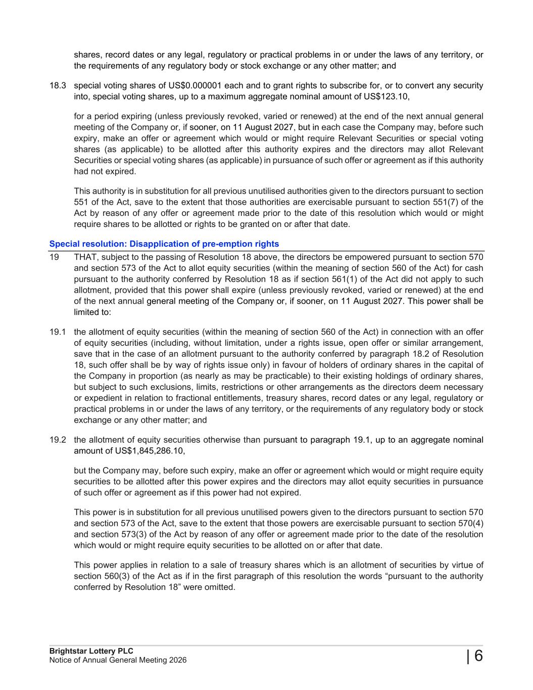Brightstar Lottery PLC Notice of Annual General Meeting 2026 | 6 shares, record dates or any legal, regulatory or practical problems in or under the laws of any territory, or the requirements of any regulatory body or stock exchange or any other matter; and 18.3 special voting shares of US$0.000001 each and to grant rights to subscribe for, or to convert any security into, special voting shares, up to a maximum aggregate nominal amount of US$123.10, for a period expiring (unless previously revoked, varied or renewed) at the end of the next annual general meeting of the Company or, if sooner, on 11 August 2027, but in each case the Company may, before such expiry, make an offer or agreement which would or might require Relevant Securities or special voting shares (as applicable) to be allotted after this authority expires and the directors may allot Relevant Securities or special voting shares (as applicable) in pursuance of such offer or agreement as if this authority had not expired. This authority is in substitution for all previous unutilised authorities given to the directors pursuant to section 551 of the Act, save to the extent that those authorities are exercisable pursuant to section 551(7) of the Act by reason of any offer or agreement made prior to the date of this resolution which would or might require shares to be allotted or rights to be granted on or after that date. Special resolution: Disapplication of pre-emption rights 19 THAT, subject to the passing of Resolution 18 above, the directors be empowered pursuant to section 570 and section 573 of the Act to allot equity securities (within the meaning of section 560 of the Act) for cash pursuant to the authority conferred by Resolution 18 as if section 561(1) of the Act did not apply to such allotment, provided that this power shall expire (unless previously revoked, varied or renewed) at the end of the next annual general meeting of the Company or, if sooner, on 11 August 2027. This power shall be limited to: 19.1 the allotment of equity securities (within the meaning of section 560 of the Act) in connection with an offer of equity securities (including, without limitation, under a rights issue, open offer or similar arrangement, save that in the case of an allotment pursuant to the authority conferred by paragraph 18.2 of Resolution 18, such offer shall be by way of rights issue only) in favour of holders of ordinary shares in the capital of the Company in proportion (as nearly as may be practicable) to their existing holdings of ordinary shares, but subject to such exclusions, limits, restrictions or other arrangements as the directors deem necessary or expedient in relation to fractional entitlements, treasury shares, record dates or any legal, regulatory or practical problems in or under the laws of any territory, or the requirements of any regulatory body or stock exchange or any other matter; and 19.2 the allotment of equity securities otherwise than pursuant to paragraph 19.1, up to an aggregate nominal amount of US$1,845,286.10, but the Company may, before such expiry, make an offer or agreement which would or might require equity securities to be allotted after this power expires and the directors may allot equity securities in pursuance of such offer or agreement as if this power had not expired. This power is in substitution for all previous unutilised powers given to the directors pursuant to section 570 and section 573 of the Act, save to the extent that those powers are exercisable pursuant to section 570(4) and section 573(3) of the Act by reason of any offer or agreement made prior to the date of the resolution which would or might require equity securities to be allotted on or after that date. This power applies in relation to a sale of treasury shares which is an allotment of securities by virtue of section 560(3) of the Act as if in the first paragraph of this resolution the words “pursuant to the authority conferred by Resolution 18” were omitted.