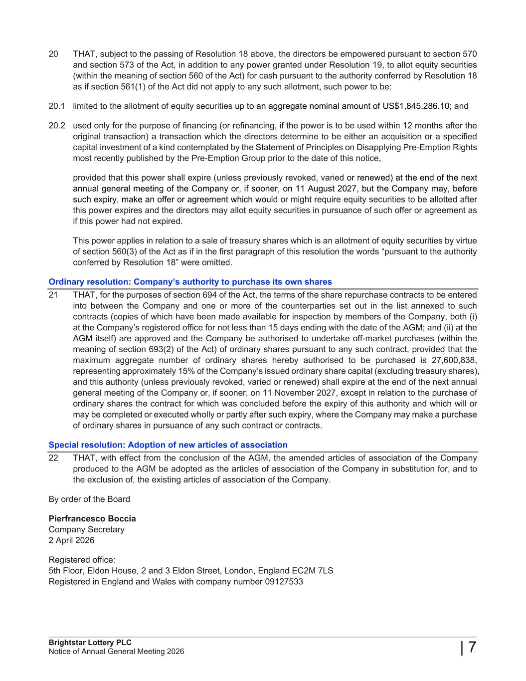 Brightstar Lottery PLC Notice of Annual General Meeting 2026 | 7 20 THAT, subject to the passing of Resolution 18 above, the directors be empowered pursuant to section 570 and section 573 of the Act, in addition to any power granted under Resolution 19, to allot equity securities (within the meaning of section 560 of the Act) for cash pursuant to the authority conferred by Resolution 18 as if section 561(1) of the Act did not apply to any such allotment, such power to be: 20.1 limited to the allotment of equity securities up to an aggregate nominal amount of US$1,845,286.10; and 20.2 used only for the purpose of financing (or refinancing, if the power is to be used within 12 months after the original transaction) a transaction which the directors determine to be either an acquisition or a specified capital investment of a kind contemplated by the Statement of Principles on Disapplying Pre-Emption Rights most recently published by the Pre-Emption Group prior to the date of this notice, provided that this power shall expire (unless previously revoked, varied or renewed) at the end of the next annual general meeting of the Company or, if sooner, on 11 August 2027, but the Company may, before such expiry, make an offer or agreement which would or might require equity securities to be allotted after this power expires and the directors may allot equity securities in pursuance of such offer or agreement as if this power had not expired. This power applies in relation to a sale of treasury shares which is an allotment of equity securities by virtue of section 560(3) of the Act as if in the first paragraph of this resolution the words “pursuant to the authority conferred by Resolution 18” were omitted. Ordinary resolution: Company’s authority to purchase its own shares 21 THAT, for the purposes of section 694 of the Act, the terms of the share repurchase contracts to be entered into between the Company and one or more of the counterparties set out in the list annexed to such contracts (copies of which have been made available for inspection by members of the Company, both (i) at the Company’s registered office for not less than 15 days ending with the date of the AGM; and (ii) at the AGM itself) are approved and the Company be authorised to undertake off-market purchases (within the meaning of section 693(2) of the Act) of ordinary shares pursuant to any such contract, provided that the maximum aggregate number of ordinary shares hereby authorised to be purchased is 27,600,838, representing approximately 15% of the Company’s issued ordinary share capital (excluding treasury shares), and this authority (unless previously revoked, varied or renewed) shall expire at the end of the next annual general meeting of the Company or, if sooner, on 11 November 2027, except in relation to the purchase of ordinary shares the contract for which was concluded before the expiry of this authority and which will or may be completed or executed wholly or partly after such expiry, where the Company may make a purchase of ordinary shares in pursuance of any such contract or contracts. Special resolution: Adoption of new articles of association 22 THAT, with effect from the conclusion of the AGM, the amended articles of association of the Company produced to the AGM be adopted as the articles of association of the Company in substitution for, and to the exclusion of, the existing articles of association of the Company. By order of the Board Pierfrancesco Boccia Company Secretary 2 April 2026 Registered office: 5th Floor, Eldon House, 2 and 3 Eldon Street, London, England EC2M 7LS Registered in England and Wales with company number 09127533