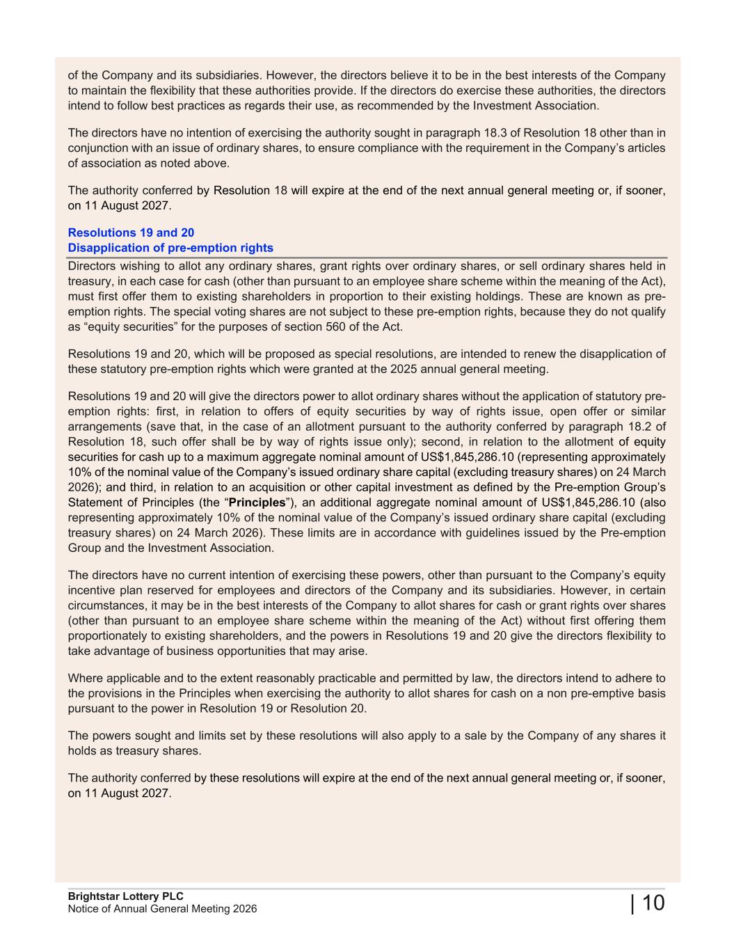 Brightstar Lottery PLC Notice of Annual General Meeting 2026 | 10 of the Company and its subsidiaries. However, the directors believe it to be in the best interests of the Company to maintain the flexibility that these authorities provide. If the directors do exercise these authorities, the directors intend to follow best practices as regards their use, as recommended by the Investment Association. The directors have no intention of exercising the authority sought in paragraph 18.3 of Resolution 18 other than in conjunction with an issue of ordinary shares, to ensure compliance with the requirement in the Company’s articles of association as noted above. The authority conferred by Resolution 18 will expire at the end of the next annual general meeting or, if sooner, on 11 August 2027. Resolutions 19 and 20 Disapplication of pre-emption rights Directors wishing to allot any ordinary shares, grant rights over ordinary shares, or sell ordinary shares held in treasury, in each case for cash (other than pursuant to an employee share scheme within the meaning of the Act), must first offer them to existing shareholders in proportion to their existing holdings. These are known as pre- emption rights. The special voting shares are not subject to these pre-emption rights, because they do not qualify as “equity securities” for the purposes of section 560 of the Act. Resolutions 19 and 20, which will be proposed as special resolutions, are intended to renew the disapplication of these statutory pre-emption rights which were granted at the 2025 annual general meeting. Resolutions 19 and 20 will give the directors power to allot ordinary shares without the application of statutory pre- emption rights: first, in relation to offers of equity securities by way of rights issue, open offer or similar arrangements (save that, in the case of an allotment pursuant to the authority conferred by paragraph 18.2 of Resolution 18, such offer shall be by way of rights issue only); second, in relation to the allotment of equity securities for cash up to a maximum aggregate nominal amount of US$1,845,286.10 (representing approximately 10% of the nominal value of the Company’s issued ordinary share capital (excluding treasury shares) on 24 March 2026); and third, in relation to an acquisition or other capital investment as defined by the Pre-emption Group’s Statement of Principles (the “Principles”), an additional aggregate nominal amount of US$1,845,286.10 (also representing approximately 10% of the nominal value of the Company’s issued ordinary share capital (excluding treasury shares) on 24 March 2026). These limits are in accordance with guidelines issued by the Pre-emption Group and the Investment Association. The directors have no current intention of exercising these powers, other than pursuant to the Company’s equity incentive plan reserved for employees and directors of the Company and its subsidiaries. However, in certain circumstances, it may be in the best interests of the Company to allot shares for cash or grant rights over shares (other than pursuant to an employee share scheme within the meaning of the Act) without first offering them proportionately to existing shareholders, and the powers in Resolutions 19 and 20 give the directors flexibility to take advantage of business opportunities that may arise. Where applicable and to the extent reasonably practicable and permitted by law, the directors intend to adhere to the provisions in the Principles when exercising the authority to allot shares for cash on a non pre-emptive basis pursuant to the power in Resolution 19 or Resolution 20. The powers sought and limits set by these resolutions will also apply to a sale by the Company of any shares it holds as treasury shares. The authority conferred by these resolutions will expire at the end of the next annual general meeting or, if sooner, on 11 August 2027.