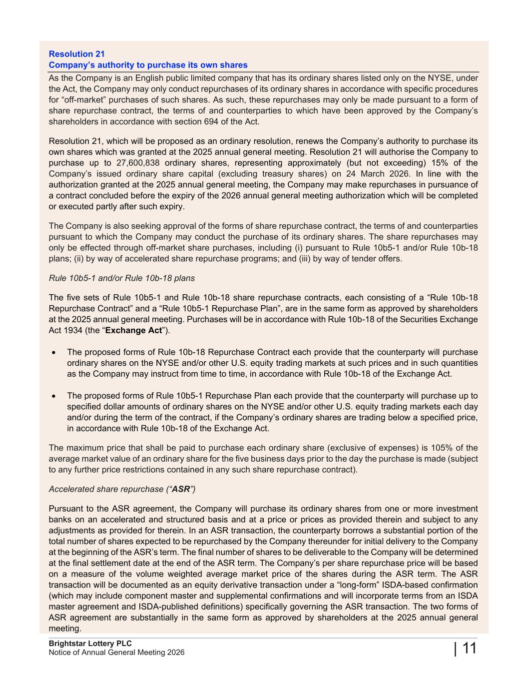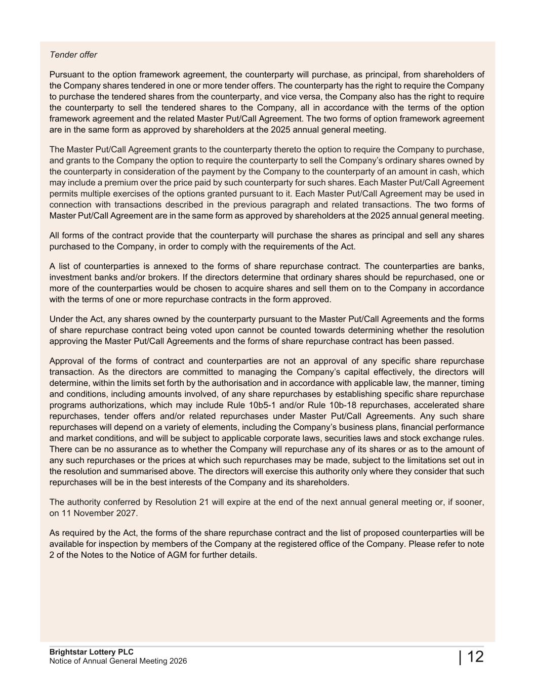 Brightstar Lottery PLC Notice of Annual General Meeting 2026 | 12 Tender offer Pursuant to the option framework agreement, the counterparty will purchase, as principal, from shareholders of the Company shares tendered in one or more tender offers. The counterparty has the right to require the Company to purchase the tendered shares from the counterparty, and vice versa, the Company also has the right to require the counterparty to sell the tendered shares to the Company, all in accordance with the terms of the option framework agreement and the related Master Put/Call Agreement. The two forms of option framework agreement are in the same form as approved by shareholders at the 2025 annual general meeting. The Master Put/Call Agreement grants to the counterparty thereto the option to require the Company to purchase, and grants to the Company the option to require the counterparty to sell the Company’s ordinary shares owned by the counterparty in consideration of the payment by the Company to the counterparty of an amount in cash, which may include a premium over the price paid by such counterparty for such shares. Each Master Put/Call Agreement permits multiple exercises of the options granted pursuant to it. Each Master Put/Call Agreement may be used in connection with transactions described in the previous paragraph and related transactions. The two forms of Master Put/Call Agreement are in the same form as approved by shareholders at the 2025 annual general meeting. All forms of the contract provide that the counterparty will purchase the shares as principal and sell any shares purchased to the Company, in order to comply with the requirements of the Act. A list of counterparties is annexed to the forms of share repurchase contract. The counterparties are banks, investment banks and/or brokers. If the directors determine that ordinary shares should be repurchased, one or more of the counterparties would be chosen to acquire shares and sell them on to the Company in accordance with the terms of one or more repurchase contracts in the form approved. Under the Act, any shares owned by the counterparty pursuant to the Master Put/Call Agreements and the forms of share repurchase contract being voted upon cannot be counted towards determining whether the resolution approving the Master Put/Call Agreements and the forms of share repurchase contract has been passed. Approval of the forms of contract and counterparties are not an approval of any specific share repurchase transaction. As the directors are committed to managing the Company’s capital effectively, the directors will determine, within the limits set forth by the authorisation and in accordance with applicable law, the manner, timing and conditions, including amounts involved, of any share repurchases by establishing specific share repurchase programs authorizations, which may include Rule 10b5-1 and/or Rule 10b-18 repurchases, accelerated share repurchases, tender offers and/or related repurchases under Master Put/Call Agreements. Any such share repurchases will depend on a variety of elements, including the Company’s business plans, financial performance and market conditions, and will be subject to applicable corporate laws, securities laws and stock exchange rules. There can be no assurance as to whether the Company will repurchase any of its shares or as to the amount of any such repurchases or the prices at which such repurchases may be made, subject to the limitations set out in the resolution and summarised above. The directors will exercise this authority only where they consider that such repurchases will be in the best interests of the Company and its shareholders. The authority conferred by Resolution 21 will expire at the end of the next annual general meeting or, if sooner, on 11 November 2027. As required by the Act, the forms of the share repurchase contract and the list of proposed counterparties will be available for inspection by members of the Company at the registered office of the Company. Please refer to note 2 of the Notes to the Notice of AGM for further details.