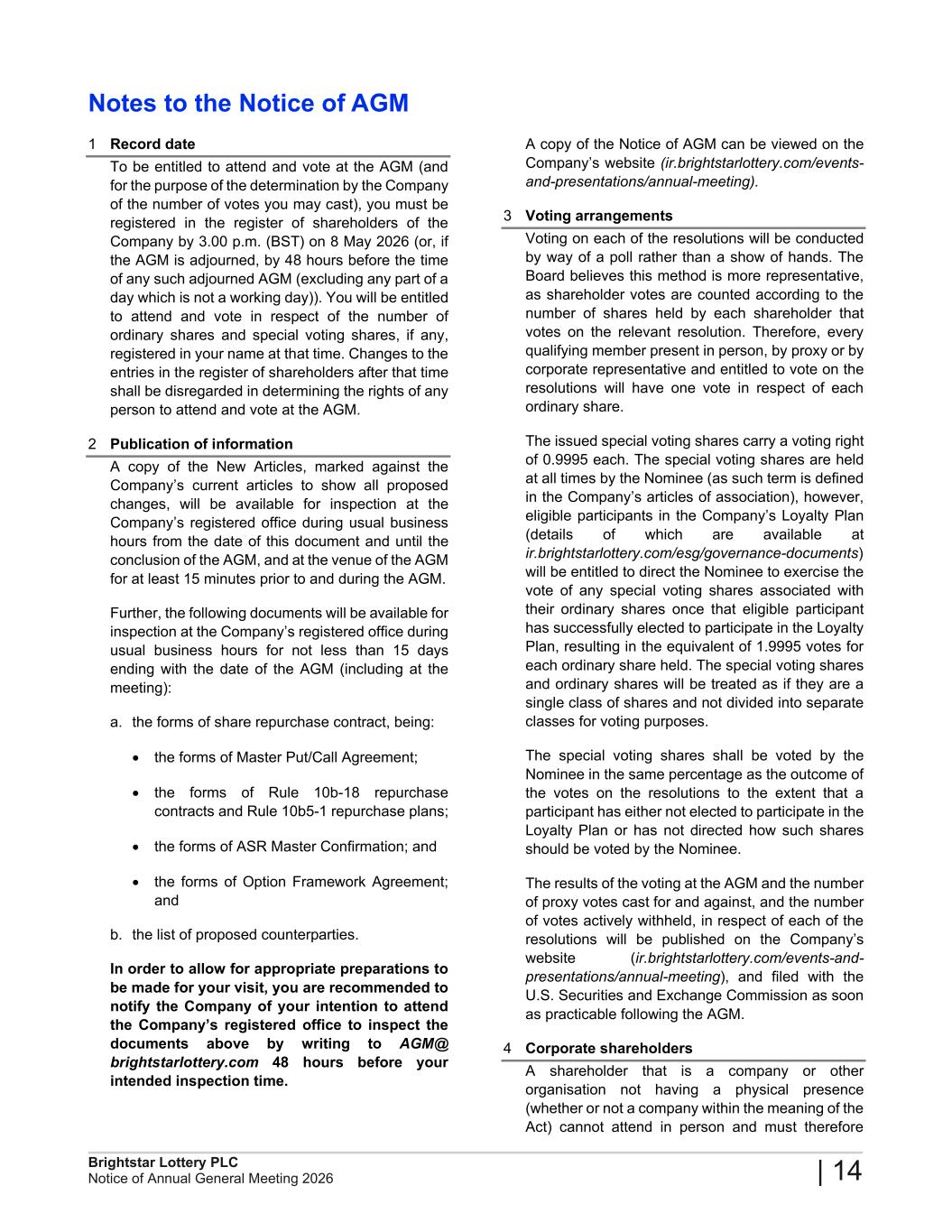 Brightstar Lottery PLC Notice of Annual General Meeting 2026 | 14 Notes to the Notice of AGM 1 Record date To be entitled to attend and vote at the AGM (and for the purpose of the determination by the Company of the number of votes you may cast), you must be registered in the register of shareholders of the Company by 3.00 p.m. (BST) on 8 May 2026 (or, if the AGM is adjourned, by 48 hours before the time of any such adjourned AGM (excluding any part of a day which is not a working day)). You will be entitled to attend and vote in respect of the number of ordinary shares and special voting shares, if any, registered in your name at that time. Changes to the entries in the register of shareholders after that time shall be disregarded in determining the rights of any person to attend and vote at the AGM. 2 Publication of information A copy of the New Articles, marked against the Company’s current articles to show all proposed changes, will be available for inspection at the Company’s registered office during usual business hours from the date of this document and until the conclusion of the AGM, and at the venue of the AGM for at least 15 minutes prior to and during the AGM. Further, the following documents will be available for inspection at the Company’s registered office during usual business hours for not less than 15 days ending with the date of the AGM (including at the meeting): a. the forms of share repurchase contract, being: • the forms of Master Put/Call Agreement; • the forms of Rule 10b-18 repurchase contracts and Rule 10b5-1 repurchase plans; • the forms of ASR Master Confirmation; and • the forms of Option Framework Agreement; and b. the list of proposed counterparties. In order to allow for appropriate preparations to be made for your visit, you are recommended to notify the Company of your intention to attend the Company’s registered office to inspect the documents above by writing to AGM@ brightstarlottery.com 48 hours before your intended inspection time. A copy of the Notice of AGM can be viewed on the Company’s website (ir.brightstarlottery.com/events- and-presentations/annual-meeting). 3 Voting arrangements Voting on each of the resolutions will be conducted by way of a poll rather than a show of hands. The Board believes this method is more representative, as shareholder votes are counted according to the number of shares held by each shareholder that votes on the relevant resolution. Therefore, every qualifying member present in person, by proxy or by corporate representative and entitled to vote on the resolutions will have one vote in respect of each ordinary share. The issued special voting shares carry a voting right of 0.9995 each. The special voting shares are held at all times by the Nominee (as such term is defined in the Company’s articles of association), however, eligible participants in the Company’s Loyalty Plan (details of which are available at ir.brightstarlottery.com/esg/governance-documents) will be entitled to direct the Nominee to exercise the vote of any special voting shares associated with their ordinary shares once that eligible participant has successfully elected to participate in the Loyalty Plan, resulting in the equivalent of 1.9995 votes for each ordinary share held. The special voting shares and ordinary shares will be treated as if they are a single class of shares and not divided into separate classes for voting purposes. The special voting shares shall be voted by the Nominee in the same percentage as the outcome of the votes on the resolutions to the extent that a participant has either not elected to participate in the Loyalty Plan or has not directed how such shares should be voted by the Nominee. The results of the voting at the AGM and the number of proxy votes cast for and against, and the number of votes actively withheld, in respect of each of the resolutions will be published on the Company’s website (ir.brightstarlottery.com/events-and- presentations/annual-meeting), and filed with the U.S. Securities and Exchange Commission as soon as practicable following the AGM. 4 Corporate shareholders A shareholder that is a company or other organisation not having a physical presence (whether or not a company within the meaning of the Act) cannot attend in person and must therefore