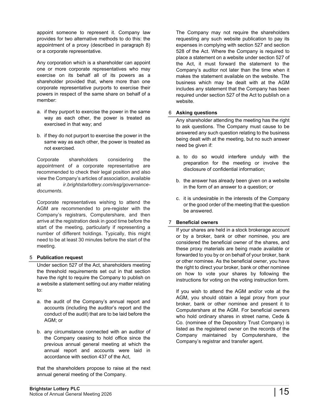 Brightstar Lottery PLC Notice of Annual General Meeting 2026 | 15 appoint someone to represent it. Company law provides for two alternative methods to do this: the appointment of a proxy (described in paragraph 8) or a corporate representative. Any corporation which is a shareholder can appoint one or more corporate representatives who may exercise on its behalf all of its powers as a shareholder provided that, where more than one corporate representative purports to exercise their powers in respect of the same share on behalf of a member: a. if they purport to exercise the power in the same way as each other, the power is treated as exercised in that way; and b. if they do not purport to exercise the power in the same way as each other, the power is treated as not exercised. Corporate shareholders considering the appointment of a corporate representative are recommended to check their legal position and also view the Company’s articles of association, available at ir.brightstarlottery.com/esg/governance- documents. Corporate representatives wishing to attend the AGM are recommended to pre-register with the Company’s registrars, Computershare, and then arrive at the registration desk in good time before the start of the meeting, particularly if representing a number of different holdings. Typically, this might need to be at least 30 minutes before the start of the meeting. 5 Publication request Under section 527 of the Act, shareholders meeting the threshold requirements set out in that section have the right to require the Company to publish on a website a statement setting out any matter relating to: a. the audit of the Company’s annual report and accounts (including the auditor’s report and the conduct of the audit) that are to be laid before the AGM; or b. any circumstance connected with an auditor of the Company ceasing to hold office since the previous annual general meeting at which the annual report and accounts were laid in accordance with section 437 of the Act, that the shareholders propose to raise at the next annual general meeting of the Company. The Company may not require the shareholders requesting any such website publication to pay its expenses in complying with section 527 and section 528 of the Act. Where the Company is required to place a statement on a website under section 527 of the Act, it must forward the statement to the Company’s auditor not later than the time when it makes the statement available on the website. The business which may be dealt with at the AGM includes any statement that the Company has been required under section 527 of the Act to publish on a website. 6 Asking questions Any shareholder attending the meeting has the right to ask questions. The Company must cause to be answered any such question relating to the business being dealt with at the meeting, but no such answer need be given if: a. to do so would interfere unduly with the preparation for the meeting or involve the disclosure of confidential information; b. the answer has already been given on a website in the form of an answer to a question; or c. it is undesirable in the interests of the Company or the good order of the meeting that the question be answered. 7 Beneficial owners If your shares are held in a stock brokerage account or by a broker, bank or other nominee, you are considered the beneficial owner of the shares, and these proxy materials are being made available or forwarded to you by or on behalf of your broker, bank or other nominee. As the beneficial owner, you have the right to direct your broker, bank or other nominee on how to vote your shares by following the instructions for voting on the voting instruction form. If you wish to attend the AGM and/or vote at the AGM, you should obtain a legal proxy from your broker, bank or other nominee and present it to Computershare at the AGM. For beneficial owners who hold ordinary shares in street name, Cede & Co. (nominee of the Depository Trust Company) is listed as the registered owner on the records of the Company maintained by Computershare, the Company’s registrar and transfer agent.