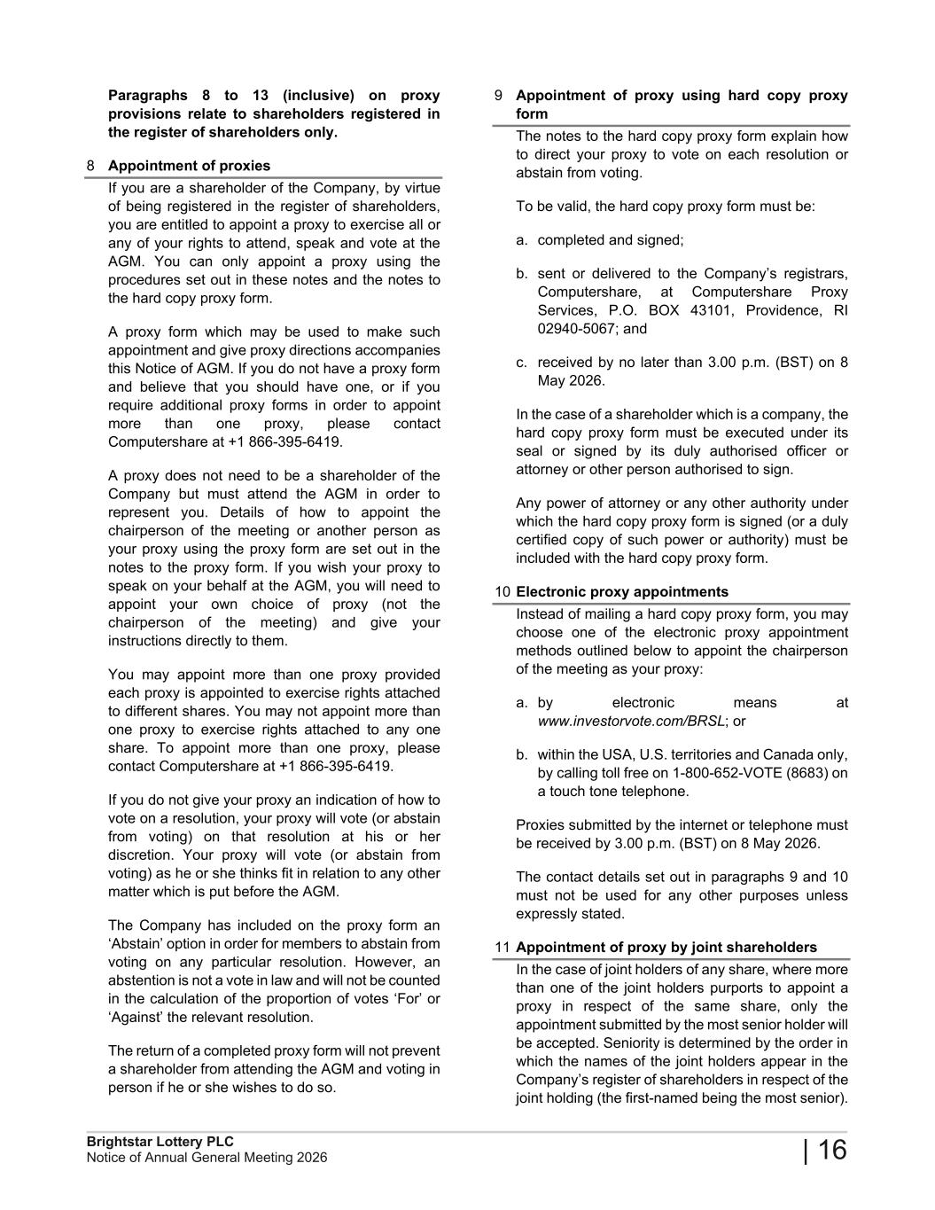 Brightstar Lottery PLC Notice of Annual General Meeting 2026 | 16 Paragraphs 8 to 13 (inclusive) on proxy provisions relate to shareholders registered in the register of shareholders only. 8 Appointment of proxies If you are a shareholder of the Company, by virtue of being registered in the register of shareholders, you are entitled to appoint a proxy to exercise all or any of your rights to attend, speak and vote at the AGM. You can only appoint a proxy using the procedures set out in these notes and the notes to the hard copy proxy form. A proxy form which may be used to make such appointment and give proxy directions accompanies this Notice of AGM. If you do not have a proxy form and believe that you should have one, or if you require additional proxy forms in order to appoint more than one proxy, please contact Computershare at +1 866-395-6419. A proxy does not need to be a shareholder of the Company but must attend the AGM in order to represent you. Details of how to appoint the chairperson of the meeting or another person as your proxy using the proxy form are set out in the notes to the proxy form. If you wish your proxy to speak on your behalf at the AGM, you will need to appoint your own choice of proxy (not the chairperson of the meeting) and give your instructions directly to them. You may appoint more than one proxy provided each proxy is appointed to exercise rights attached to different shares. You may not appoint more than one proxy to exercise rights attached to any one share. To appoint more than one proxy, please contact Computershare at +1 866-395-6419. If you do not give your proxy an indication of how to vote on a resolution, your proxy will vote (or abstain from voting) on that resolution at his or her discretion. Your proxy will vote (or abstain from voting) as he or she thinks fit in relation to any other matter which is put before the AGM. The Company has included on the proxy form an ‘Abstain’ option in order for members to abstain from voting on any particular resolution. However, an abstention is not a vote in law and will not be counted in the calculation of the proportion of votes ‘For’ or ‘Against’ the relevant resolution. The return of a completed proxy form will not prevent a shareholder from attending the AGM and voting in person if he or she wishes to do so. 9 Appointment of proxy using hard copy proxy form The notes to the hard copy proxy form explain how to direct your proxy to vote on each resolution or abstain from voting. To be valid, the hard copy proxy form must be: a. completed and signed; b. sent or delivered to the Company’s registrars, Computershare, at Computershare Proxy Services, P.O. BOX 43101, Providence, RI 02940-5067; and c. received by no later than 3.00 p.m. (BST) on 8 May 2026. In the case of a shareholder which is a company, the hard copy proxy form must be executed under its seal or signed by its duly authorised officer or attorney or other person authorised to sign. Any power of attorney or any other authority under which the hard copy proxy form is signed (or a duly certified copy of such power or authority) must be included with the hard copy proxy form. 10 Electronic proxy appointments Instead of mailing a hard copy proxy form, you may choose one of the electronic proxy appointment methods outlined below to appoint the chairperson of the meeting as your proxy: a. by electronic means at www.investorvote.com/BRSL; or b. within the USA, U.S. territories and Canada only, by calling toll free on 1-800-652-VOTE (8683) on a touch tone telephone. Proxies submitted by the internet or telephone must be received by 3.00 p.m. (BST) on 8 May 2026. The contact details set out in paragraphs 9 and 10 must not be used for any other purposes unless expressly stated. 11 Appointment of proxy by joint shareholders In the case of joint holders of any share, where more than one of the joint holders purports to appoint a proxy in respect of the same share, only the appointment submitted by the most senior holder will be accepted. Seniority is determined by the order in which the names of the joint holders appear in the Company’s register of shareholders in respect of the joint holding (the first-named being the most senior).