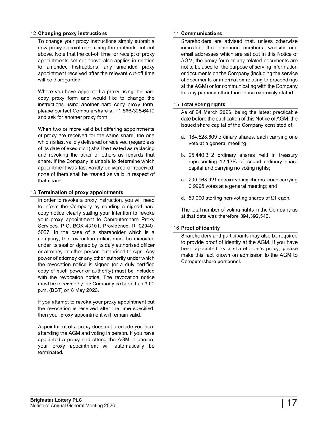 Brightstar Lottery PLC Notice of Annual General Meeting 2026 | 17 12 Changing proxy instructions To change your proxy instructions simply submit a new proxy appointment using the methods set out above. Note that the cut-off time for receipt of proxy appointments set out above also applies in relation to amended instructions; any amended proxy appointment received after the relevant cut-off time will be disregarded. Where you have appointed a proxy using the hard copy proxy form and would like to change the instructions using another hard copy proxy form, please contact Computershare at +1 866-395-6419 and ask for another proxy form. When two or more valid but differing appointments of proxy are received for the same share, the one which is last validly delivered or received (regardless of its date of execution) shall be treated as replacing and revoking the other or others as regards that share. If the Company is unable to determine which appointment was last validly delivered or received, none of them shall be treated as valid in respect of that share. 13 Termination of proxy appointments In order to revoke a proxy instruction, you will need to inform the Company by sending a signed hard copy notice clearly stating your intention to revoke your proxy appointment to Computershare Proxy Services, P.O. BOX 43101, Providence, RI 02940- 5067. In the case of a shareholder which is a company, the revocation notice must be executed under its seal or signed by its duly authorised officer or attorney or other person authorised to sign. Any power of attorney or any other authority under which the revocation notice is signed (or a duly certified copy of such power or authority) must be included with the revocation notice. The revocation notice must be received by the Company no later than 3.00 p.m. (BST) on 8 May 2026. If you attempt to revoke your proxy appointment but the revocation is received after the time specified, then your proxy appointment will remain valid. Appointment of a proxy does not preclude you from attending the AGM and voting in person. If you have appointed a proxy and attend the AGM in person, your proxy appointment will automatically be terminated. 14 Communications Shareholders are advised that, unless otherwise indicated, the telephone numbers, website and email addresses which are set out in this Notice of AGM, the proxy form or any related documents are not to be used for the purpose of serving information or documents on the Company (including the service of documents or information relating to proceedings at the AGM) or for communicating with the Company for any purpose other than those expressly stated. 15 Total voting rights As of 24 March 2026, being the latest practicable date before the publication of this Notice of AGM, the issued share capital of the Company consisted of: a. 184,528,609 ordinary shares, each carrying one vote at a general meeting; b. 25,440,312 ordinary shares held in treasury representing 12.12% of issued ordinary share capital and carrying no voting rights; c. 209,968,921 special voting shares, each carrying 0.9995 votes at a general meeting; and d. 50,000 sterling non-voting shares of £1 each. The total number of voting rights in the Company as at that date was therefore 394,392,546. 16 Proof of identity Shareholders and participants may also be required to provide proof of identity at the AGM. If you have been appointed as a shareholder’s proxy, please make this fact known on admission to the AGM to Computershare personnel.