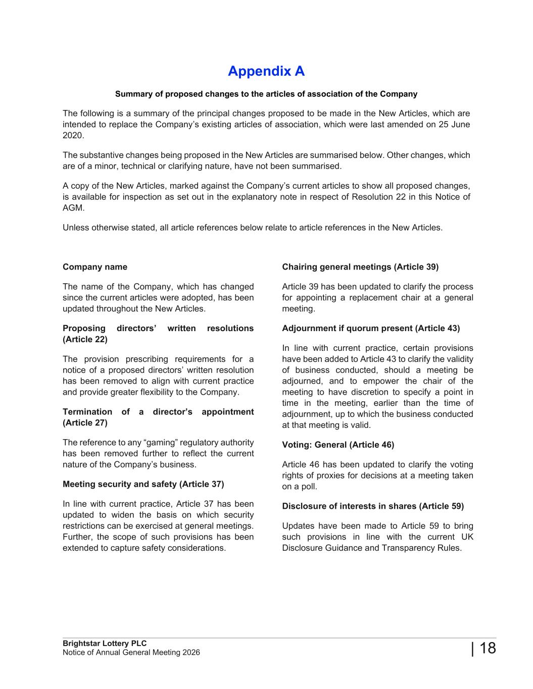 Brightstar Lottery PLC Notice of Annual General Meeting 2026 | 18 Appendix A Summary of proposed changes to the articles of association of the Company The following is a summary of the principal changes proposed to be made in the New Articles, which are intended to replace the Company’s existing articles of association, which were last amended on 25 June 2020. The substantive changes being proposed in the New Articles are summarised below. Other changes, which are of a minor, technical or clarifying nature, have not been summarised. A copy of the New Articles, marked against the Company’s current articles to show all proposed changes, is available for inspection as set out in the explanatory note in respect of Resolution 22 in this Notice of AGM. Unless otherwise stated, all article references below relate to article references in the New Articles. Company name The name of the Company, which has changed since the current articles were adopted, has been updated throughout the New Articles. Proposing directors’ written resolutions (Article 22) The provision prescribing requirements for a notice of a proposed directors’ written resolution has been removed to align with current practice and provide greater flexibility to the Company. Termination of a director’s appointment (Article 27) The reference to any “gaming” regulatory authority has been removed further to reflect the current nature of the Company’s business. Meeting security and safety (Article 37) In line with current practice, Article 37 has been updated to widen the basis on which security restrictions can be exercised at general meetings. Further, the scope of such provisions has been extended to capture safety considerations. Chairing general meetings (Article 39) Article 39 has been updated to clarify the process for appointing a replacement chair at a general meeting. Adjournment if quorum present (Article 43) In line with current practice, certain provisions have been added to Article 43 to clarify the validity of business conducted, should a meeting be adjourned, and to empower the chair of the meeting to have discretion to specify a point in time in the meeting, earlier than the time of adjournment, up to which the business conducted at that meeting is valid. Voting: General (Article 46) Article 46 has been updated to clarify the voting rights of proxies for decisions at a meeting taken on a poll. Disclosure of interests in shares (Article 59) Updates have been made to Article 59 to bring such provisions in line with the current UK Disclosure Guidance and Transparency Rules.